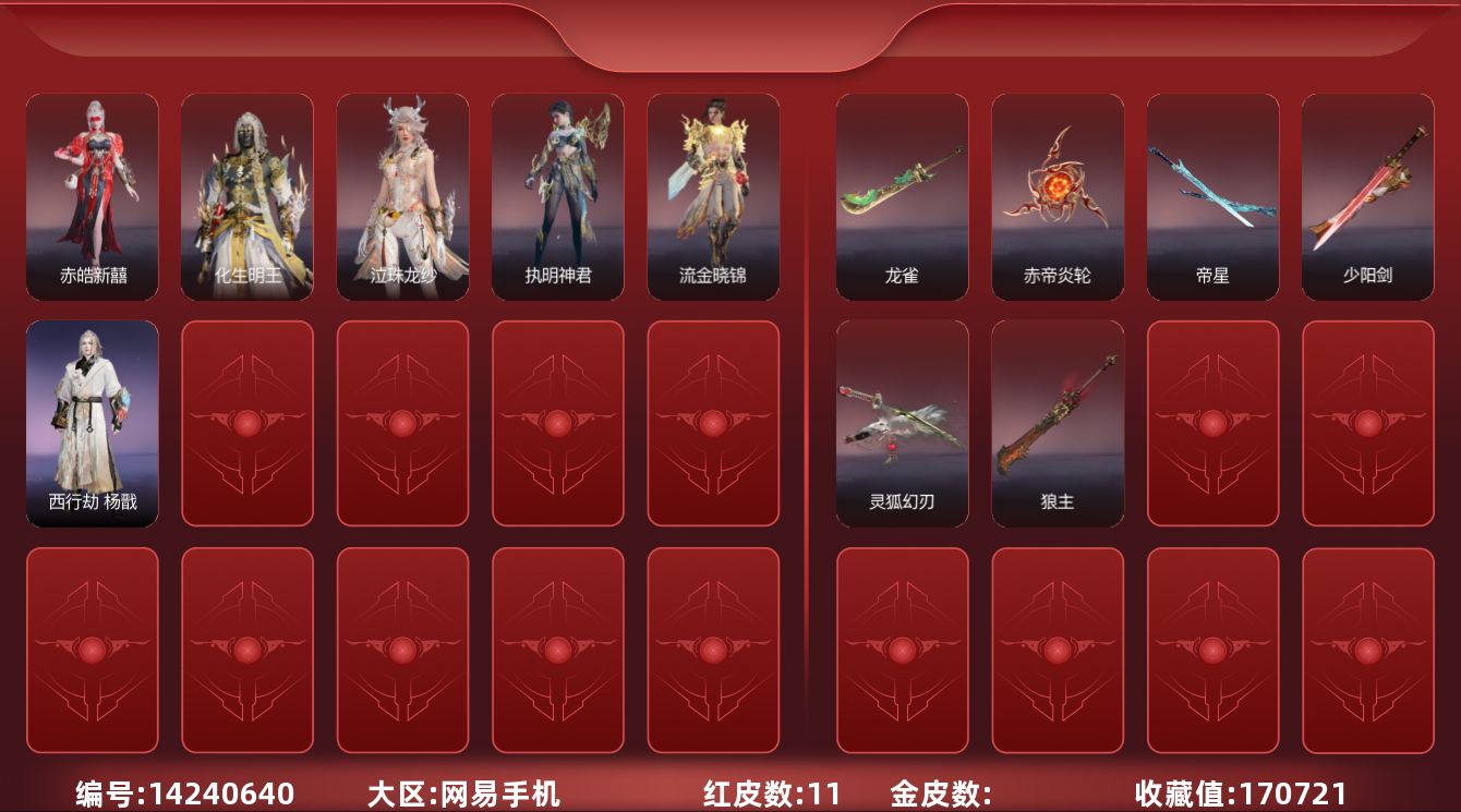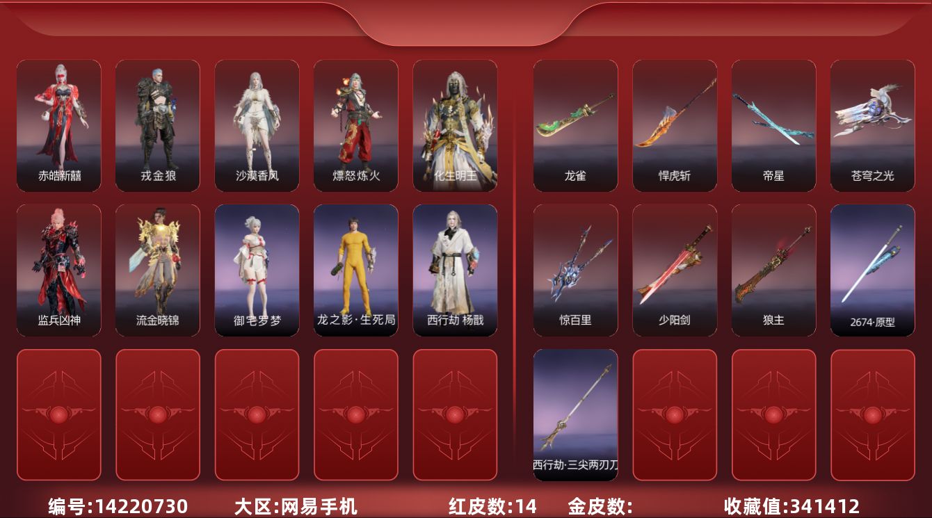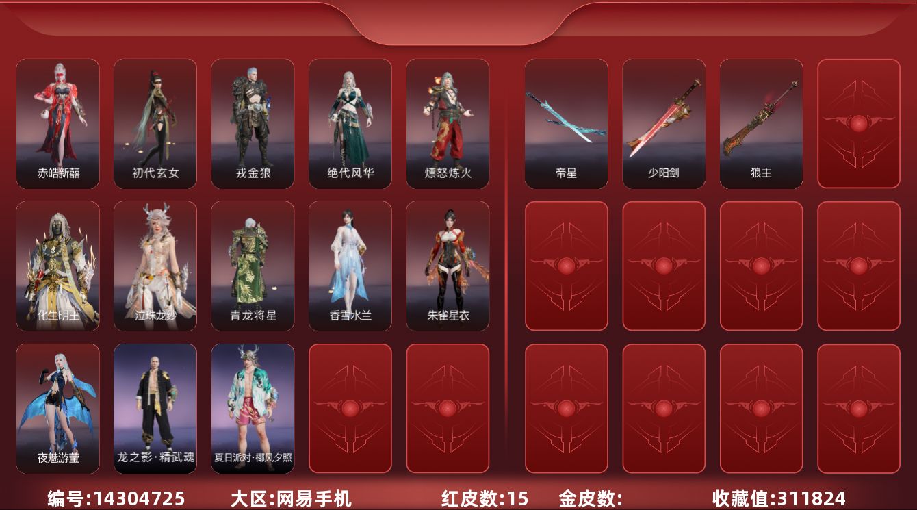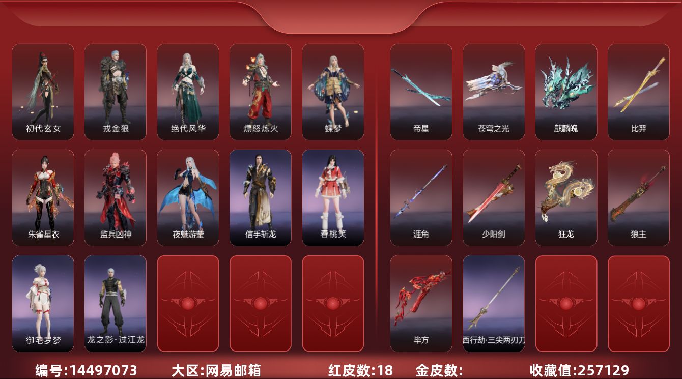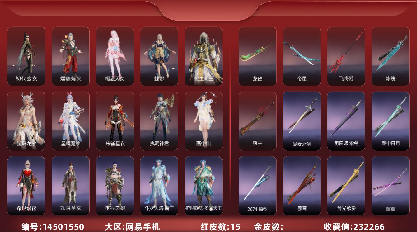 [14501550]yjj980/1.11换绑/等级270/s18三人黄金1/15红297金收藏值232266/初代玄女/星辉魔纱/朱雀星衣/化生明王/熛怒炼火/樱云天女/蝶梦/泣珠龙纱/执明神君/画中仙/冰魄_/帝星/狼主/龙雀/飞将戟//神乌造像/勾玉/剪纸彩刀/荆魂/神君印/珥冰 宁红夜:/初代玄女/耀世魂花/山川润/九阴圣女/双马尾女 沈妙:/星辉魔纱/朱雀星衣/秋藏桂/涂鸦少女/双马尾女 天海:/化生明王/白熊/若水尊者/八宝龙王/缘觉发/双马尾男 殷紫萍:/风雨谐/萍之缘/伏苓发/双马尾女 特木尔:/唐三/友情岁月/多闻天王/沙狼之怒/海神发/双马尾男 季沧海:/熛怒炼火/游四海/江海发/熛怒发/白狼发/双马尾男 胡桃:/樱云天女/蝶梦/星空投影/清雅少女/樱舞发/双马尾女 妖刀姬:/神罚之光/朔夜游方 崔三娘:/泣珠龙纱/伏波龙女/无拘/双马尾女 岳山:/常胜袍/破荆者/过江龙/万仞山发/双马尾男 无尘:/黄庭道/朝闻道/双马尾男 顾清寒:/仲夏霜华/寒烟素/禄运玉霄/绯霜发/双马尾女 武田信中:/双马尾男 迦南:/浣烟纱/瀚海苍鹰/朝颜发/双马尾女 胡为:/蛤蟆头领/杜虎符/福瑞天泽/双马尾男 季莹莹:/八极/持国天王/妙音发/傲寒发/双马尾女 玉玲珑:/赤阳天狐/广目天王/惊雀发/双马尾女 哈迪:/天工奥妙/秀逸发/双马尾男 魏轻:/执明神君/寿竹云春/玄冥发/双马尾女 刘炼:/虹猫/风吹雪发/双马尾男 张起灵:/孤影戎装/赤焰战灵/云间影/双马尾男 席拉:/雪铃绮歌/蜜语发/双马尾女 蓝梦:/画中仙/双马尾女 万钧:/双马尾男 李寻欢:/双马尾男 拳刃:/镇恶 长剑:/冰魄_/伞剑/含光承影/壶中日月/湖女之剑/赤霄/2674原型 太刀:/暝视/毅魂守 横刀:/帝星/雷厉 阔刀:/狼主/龙雀/听涛_/朔方之刃/神罚之刃/雷王锯/青石猊/魂梦残响/龙蟠 斩马刀:/飞将戟/昊天 呛:/建木/灵木角/长虹 棍:/孤灯行/学宫之杖/打狗棒/糖果棍/降魔 匕首:/仙舞/判官笔/桡尺刀/马首刀 扇:/叶底花/耀夜流华/腾云歌/青峰叠扇 双截棍:/傲骨/嘶风/夔牛槌/精武/除岁 双刀:/破重云/美食家/胧夜狐影/蛋仔派对咸鱼/诡月链魂 双戟:/螭龙 连弩:/乱风云/御气弩/穿云燕 鸟铳:/天心玉/戏祥云/石中火/萤火 火炮:/兔华笼/竹露雳/貔貅吞宝/造景/钻山/雪国礼炮 五眼铳