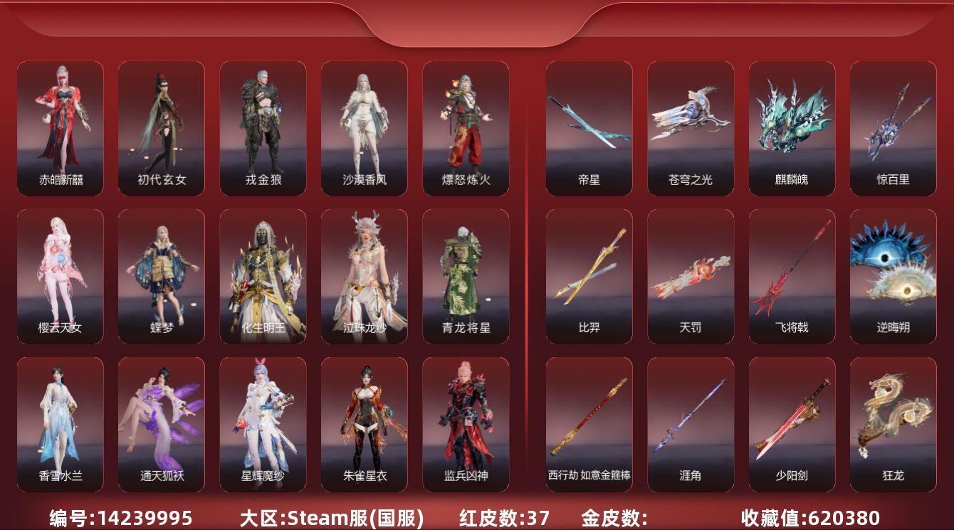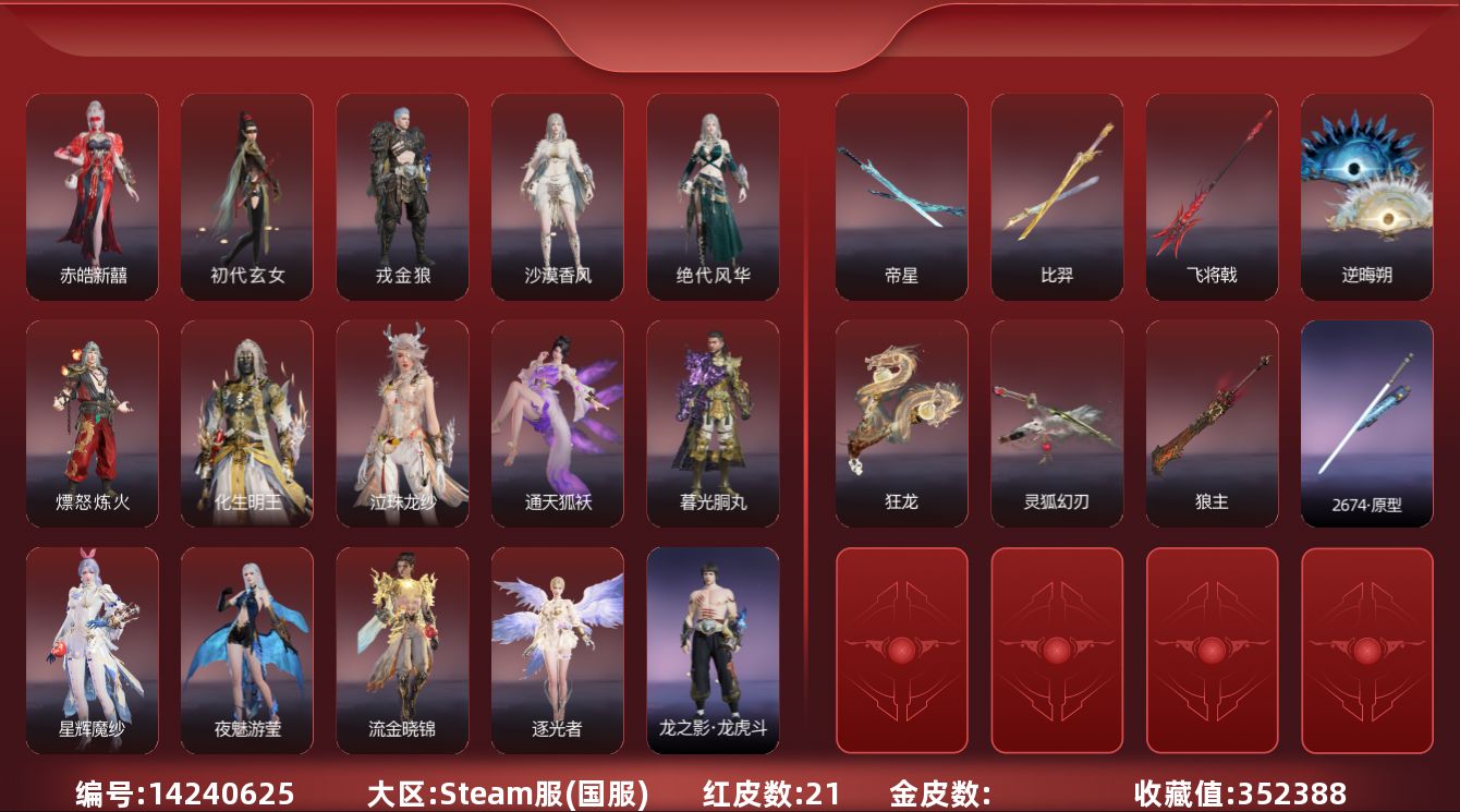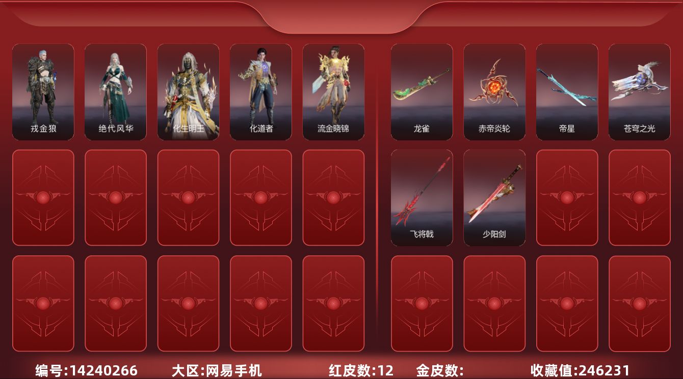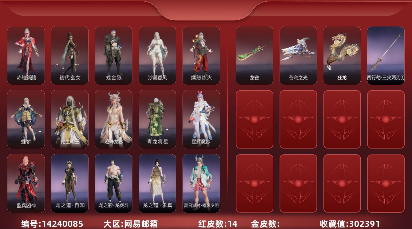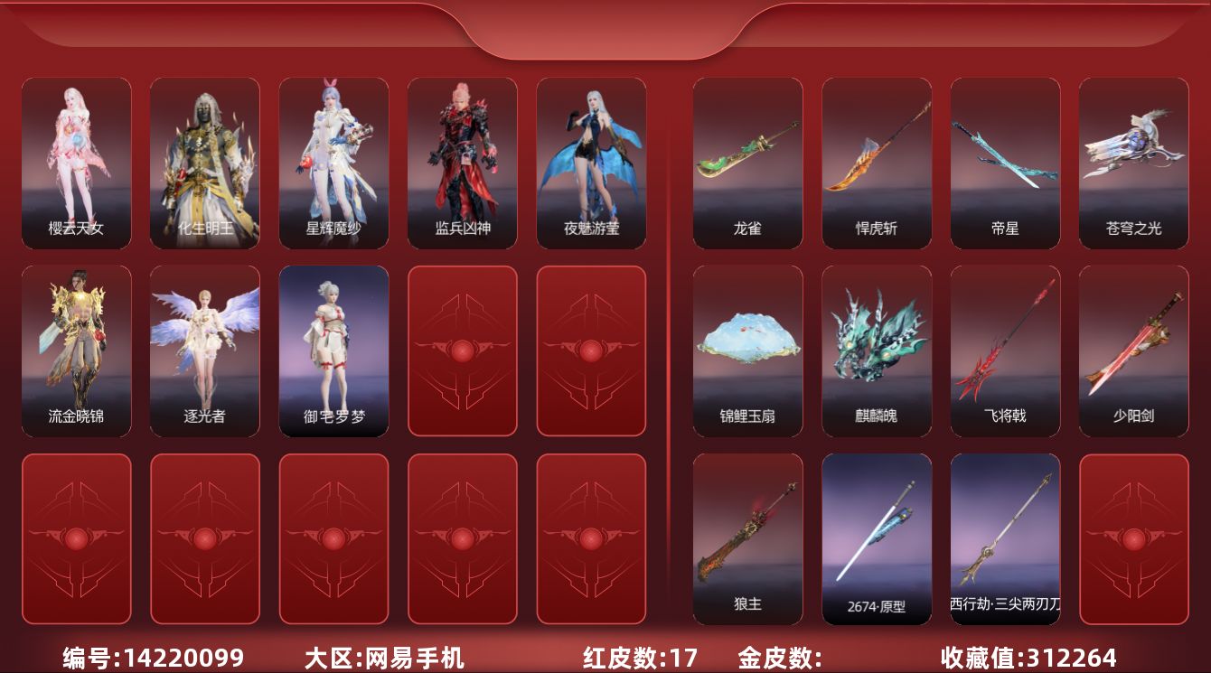 [14501550]yjj980/1.11换绑/等级270/s18三人黄金1/15红297金收藏值232266/初代玄女/星辉魔纱/朱雀星衣/化生明王/熛怒炼火/樱云天女/蝶梦/泣珠龙纱/执明神君/画中仙/冰魄_/帝星/狼主/龙雀/飞将戟//神乌造像/勾玉/剪纸彩刀/荆魂/神君印/珥冰 宁红夜:/初代玄女/耀世魂花/山川润/九阴圣女/双马尾女 沈妙:/星辉魔纱/朱雀星衣/秋藏桂/涂鸦少女/双马尾女 天海:/化生明王/白熊/若水尊者/八宝龙王/缘觉发/双马尾男 殷紫萍:/风雨谐/萍之缘/伏苓发/双马尾女 特木尔:/唐三/友情岁月/多闻天王/沙狼之怒/海神发/双马尾男 季沧海:/熛怒炼火/游四海/江海发/熛怒发/白狼发/双马尾男 胡桃:/樱云天女/蝶梦/星空投影/清雅少女/樱舞发/双马尾女 妖刀姬:/神罚之光/朔夜游方 崔三娘:/泣珠龙纱/伏波龙女/无拘/双马尾女 岳山:/常胜袍/破荆者/过江龙/万仞山发/双马尾男 无尘:/黄庭道/朝闻道/双马尾男 顾清寒:/仲夏霜华/寒烟素/禄运玉霄/绯霜发/双马尾女 武田信中:/双马尾男 迦南:/浣烟纱/瀚海苍鹰/朝颜发/双马尾女 胡为:/蛤蟆头领/杜虎符/福瑞天泽/双马尾男 季莹莹:/八极/持国天王/妙音发/傲寒发/双马尾女 玉玲珑:/赤阳天狐/广目天王/惊雀发/双马尾女 哈迪:/天工奥妙/秀逸发/双马尾男 魏轻:/执明神君/寿竹云春/玄冥发/双马尾女 刘炼:/虹猫/风吹雪发/双马尾男 张起灵:/孤影戎装/赤焰战灵/云间影/双马尾男 席拉:/雪铃绮歌/蜜语发/双马尾女 蓝梦:/画中仙/双马尾女 万钧:/双马尾男 李寻欢:/双马尾男 拳刃:/镇恶 长剑:/冰魄_/伞剑/含光承影/壶中日月/湖女之剑/赤霄/2674原型 太刀:/暝视/毅魂守 横刀:/帝星/雷厉 阔刀:/狼主/龙雀/听涛_/朔方之刃/神罚之刃/雷王锯/青石猊/魂梦残响/龙蟠 斩马刀:/飞将戟/昊天 呛:/建木/灵木角/长虹 棍:/孤灯行/学宫之杖/打狗棒/糖果棍/降魔 匕首:/仙舞/判官笔/桡尺刀/马首刀 扇:/叶底花/耀夜流华/腾云歌/青峰叠扇 双截棍:/傲骨/嘶风/夔牛槌/精武/除岁 双刀:/破重云/美食家/胧夜狐影/蛋仔派对咸鱼/诡月链魂 双戟:/螭龙 连弩:/乱风云/御气弩/穿云燕 鸟铳:/天心玉/戏祥云/石中火/萤火 火炮:/兔华笼/竹露雳/貔貅吞宝/造景/钻山/雪国礼炮 五眼铳