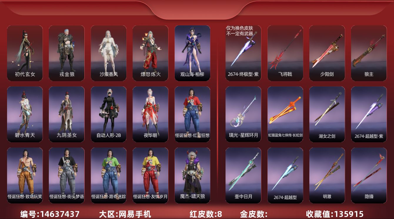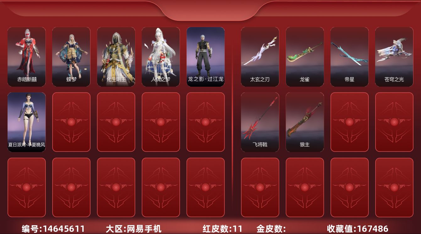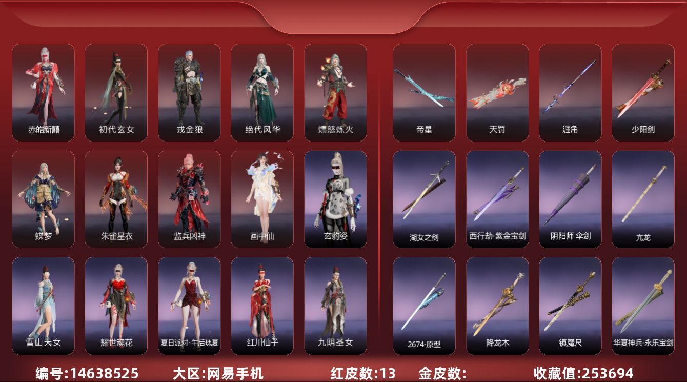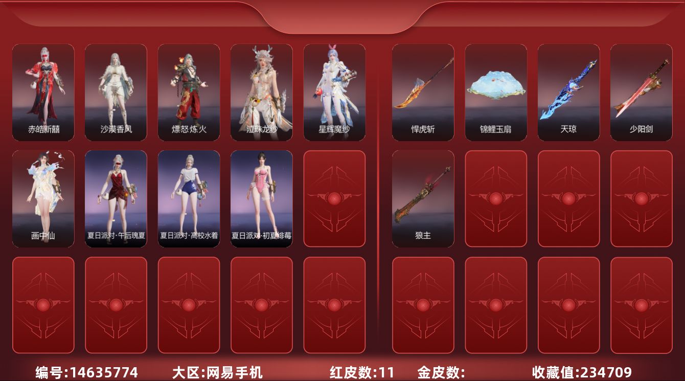 [14637572]0anoqp网易手机14个红皮泳装2个【高校水着(胡桃),夏海伏浪(天海),】奥义特效2个【荆魂岳山,石龛造像(天海),】下次换绑时间2025/12/28,等待换绑期间可以登入网易大神直接进入游戏不影响游戏体验。网易支付未实名道具货币都是默认已使用.小技能特效2个【三娃葫芦(天海),千秋匠心·凶虎(胡为),】胡为吕布全套,岳山关羽全套,武器红皮3个【飞将戟,比羿,狂龙,】其他红皮11个【流金晓锦,夜魅游莹,监兵凶神,化生明王,青龙将星,长天藏锦,蝶梦,初代玄女,戎金狼,绝代风华,熛怒炼火,】飞鼠,自动人形·2b,玄豹姿,唐三,龙心炽焰,信手斩龙,霜天红叶,龙之影·龙虎斗,枫行者,百战·破荆者,紫金玉女,夜华朝,银狼裘,护世四法·多闻天王,金羽圣鹰,浣烟纱,惊云羽,神鹰之女,观山海·青鸟,御宅花织黑丝,天钿女命,龙之影·生死局,梨园传奇·法海,武道无穷·少林,决战平安京·御神之刃,龙之影·过江龙,守誓者,常胜袍,龙之道·无拘,伏波龙女,掌珠仙子,金羽客,逆水寒·极夜天曦,姑射真人,寒英素雪,藏雨阁主,花之倾奇,枫狩,新倩女幽魂·流纨裙,沐昭,兰庭月,观山海·冬神玄冥,观山海·秋神蓐收,街头狂欢·不败擂主,护世四法·广目天王,夜绸袍,街头狂欢·涂鸦少女,观山海·朱明,西行劫·三尖两刃刀,咯咯,咕咕(连弩),葫芦兄弟·蛤蟆头领,封神录·申公豹,阿娜希塔,封神录·龙吉公主,封神录·姜子牙,观山海·相柳,绿野守护·山漠狞影,绿野守护·悠竹萌客,九骊之君,