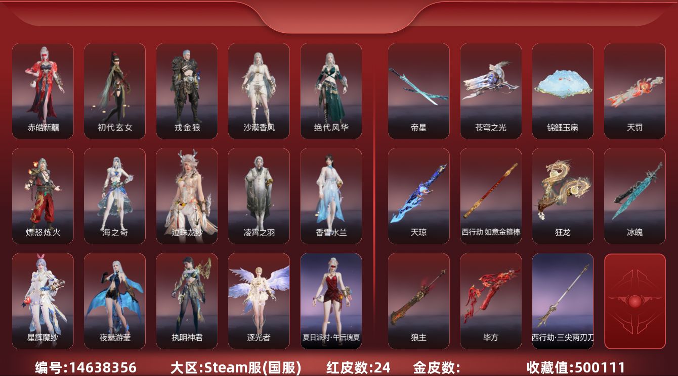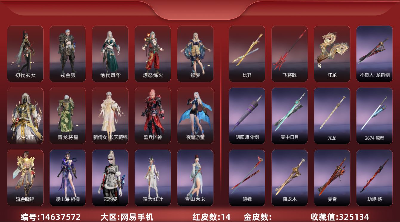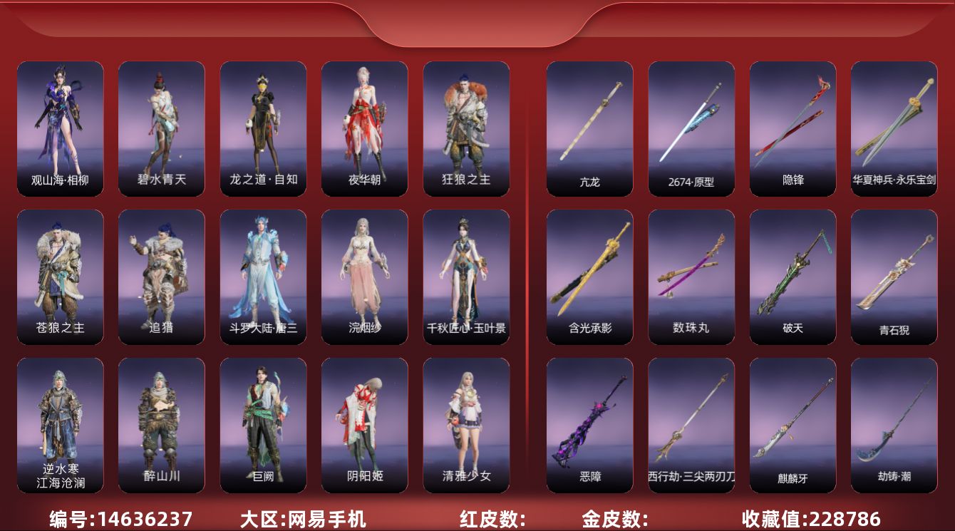 [14636237]p6421/可换绑/等级206/s18三人白银1/13红295金收藏值228786/|等级206|铂金2530|幻丝180835|金砖12|通行证lv.187/红色神品:/赤皓新囍宁红夜皮肤/化生明王天海皮肤/熛怒炼火季沧海皮肤/蝶梦胡桃皮肤/泣珠龙纱崔三娘皮肤/监兵凶神胡为皮肤/苍穹之光五眼铳皮肤/麒麟魄拳刃皮肤/少阳剑长剑皮肤/飞将戟斩马刀皮肤/西行劫·如意金箍棒棍皮肤/狂龙双节棍皮肤/变身器:/揽九天哈迪奥义特效/角色金色皮肤:/开辟鸿蒙·山川润/观山海·相柳/夜华朝/龙之道·自知/碧水青天/绿野守护·悠竹萌客/楚韵九歌·山鬼/观山海·腓腓/武道无穷·少林/八宝龙王/持威明王/开辟鸿蒙·风雨谐/斗罗大陆·唐三/苍狼之主/追猎/巨阙/逆水寒·江海沧澜/醉山川/阴阳姬/清雅少女/妖刀姬/阿娜希塔/楚韵九歌·湘夫人/伏波龙女/西行劫·杨戬/华夏宝甲·汉光/黄庭道/封神录·申公豹/若谷/禄运玉霄/封神录·龙吉公主/千秋匠心·玉叶景/浣烟纱/福瑞天泽/葫芦兄弟·蛤蟆头领/干将莫邪/护世四法·持国天王/封神录·妲己/日影花阴/冥渊/夜绸袍/夏日派对·半夏晚风/逆水寒·极夜天曦/封神录·姜子牙/绿野守护·山漠狞影/开辟鸿蒙·日月明/雪铃绮歌/发型金色皮肤:/【挑染】泠川发/簪缨宁红夜发型/绿野守护·娇憨沈妙发型/【挑染】自在天海发型/伏苓殷紫萍发型/斗罗大陆·海神特木尔发型/逆水寒·江海季沧海发型/含锋季沧海发型/巫师3·白狼发/月丹胡桃发型/【挑染】樱舞胡桃发型/【挑染】填海崔三娘发型/绿野守护·冷傲崔三娘发型/封神录·红鸾星顾清寒发型/排霜发/千秋匠心·琳琅迦南发型/啸风胡为发型/幽焰季莹莹发型/缱绻季莹莹发型/封神录·笼烟芍药玉玲珑发型/秀逸胡为发型/月魄哈迪发型/逆水寒·极夜魏轻发型/【挑染】风吹雪刘炼发型/封神录·仙风刘炼发型/蜜语发/武器金色皮肤:/穿云燕/咕咕/天牛翼/千机弩/朱雀/绿野守护·雨幕/引冰落/萤火/天心玉/雪国礼炮/兔华笼/钻山/竹霹雳/龙啸/错误2/鹦鹉螺/乌木弓/豹胎易筋弓/狻猊吼/阴阳师·雅矢/莲心剑雨/炎魔/无相印/绿野守护·毛乎乎/天狐/2674·原型/亢龙/隐锋/华夏神兵·永乐宝剑/含光承影/毅魂