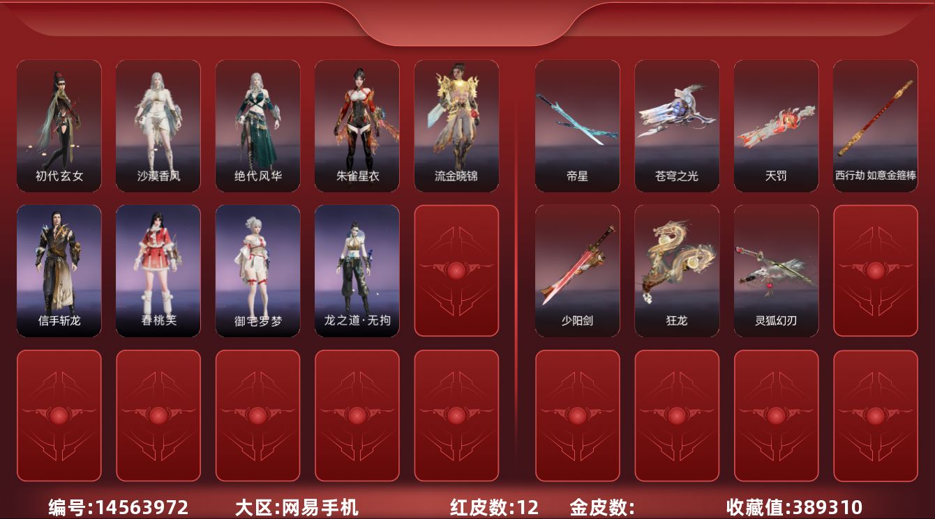 [14561012]yjj987/1.13换绑/等级390/s18三人铂金4/16红466金收藏值306496/星辉魔纱/熛怒炼火/樱云天女/蝶梦/绝代风华/沙漠香风/监兵凶神/夜魅游莹/少阳剑/灵狐幻刃/帝星/比羿/飞将戟/天琼/锦鲤玉扇/苍穹之光/勾玉 宁红夜:/耀世魂花/倒反阴阳炽羽/夜华朝/簪缨发/云霞发/双马尾女 沈妙:/星辉魔纱/悠竹萌客/千丝发/娇憨发/双马尾女 天海:/觉明尊者/少林/八宝龙王/双马尾男 殷紫萍:/春雪/天禄瑞光/萍之缘/花间影/瑶光沐月/伏苓发/降香发/双马尾女 特木尔:/街头梦语/唐三/追猎/海神发/双马尾男 季沧海:/熛怒炼火/巨阙/杰洛特/精武魂/游四海/江海发/含锋发/白狼发/双马尾男 胡桃:/樱云天女/蝶梦/日道神子/小可/高校水着/御宅罗梦/月丹发/星桥发/双马尾女 妖刀姬:/暗夜利刃 崔三娘:/文鳐/暗沼摩罗/阿娜希塔/冷傲发/双马尾女 岳山:/戍关将/常胜袍/金戈止/过江龙/万仞山发/双马尾男 无尘:/申公豹/司天命/清威发/双马尾男 顾清寒:/龙吉公主/紫微星命/禄运玉霄/金襦玉衫/仲夏霜华/灵儿发/绯霜发/红鸾星发/双马尾女 武田信中:/花之倾奇/麟鹿大铠/双马尾男 迦南:/绝代风华/沙漠香风/玉叶景/观山海青鸟/胡旋女/浣烟纱/瀚海苍鹰/翔鸾发/青鸾发/琳琅发/双马尾女 胡为:/监兵凶神/蛤蟆头领/悟空/福瑞天泽/秋神蓐收/天刑发/双马尾男 季莹莹:/夜魅游莹/干将莫邪/丝莼/冬神玄冥/冥泉发/幽焰发/缱绻发/流萤发/双马尾女 玉玲珑:/羞花/赤夏悠漾/玄绶罗衣/妲己/广目天王/黄昏巫主/古溪发/笼烟芍药发/露华发/双马尾女 哈迪:/夜绸袍/天工奥妙/狮鬓发/秀逸发/双马尾男 魏轻:/双马尾女 刘炼:/姜子牙/金财聚辉/仙风发/双马尾男 张起灵:/山漠狞影/赤焰战灵/双马尾男 席拉:/暧冬茶馨/天虹咏/特莉丝/雪铃绮歌/王室顾问发/蜜语发/双马尾女 蓝梦:/双马尾女 万钧:/雷行猎手/迅猛发/双马尾男 李寻欢:/双马尾男 拳刃:/天狐/毛乎乎/醒狮 长剑:/少阳剑/亢龙/冷香/含光承影/壶中日月/湖女之剑/琴心/监星尺/紫金宝剑/赤霄/隐锋/2674原型 太刀:/灵狐幻刃/数珠丸/雷赐/魂花晶 横刀:/帝星/比羿/烛泪/白鹿/雷厉 阔刀:/斩银河/破天/赤影妖刀/雷王锯/青石猊/龙蟠 斩马刀:/飞将戟/三尖两刃刀/断月影/朱明/麒
