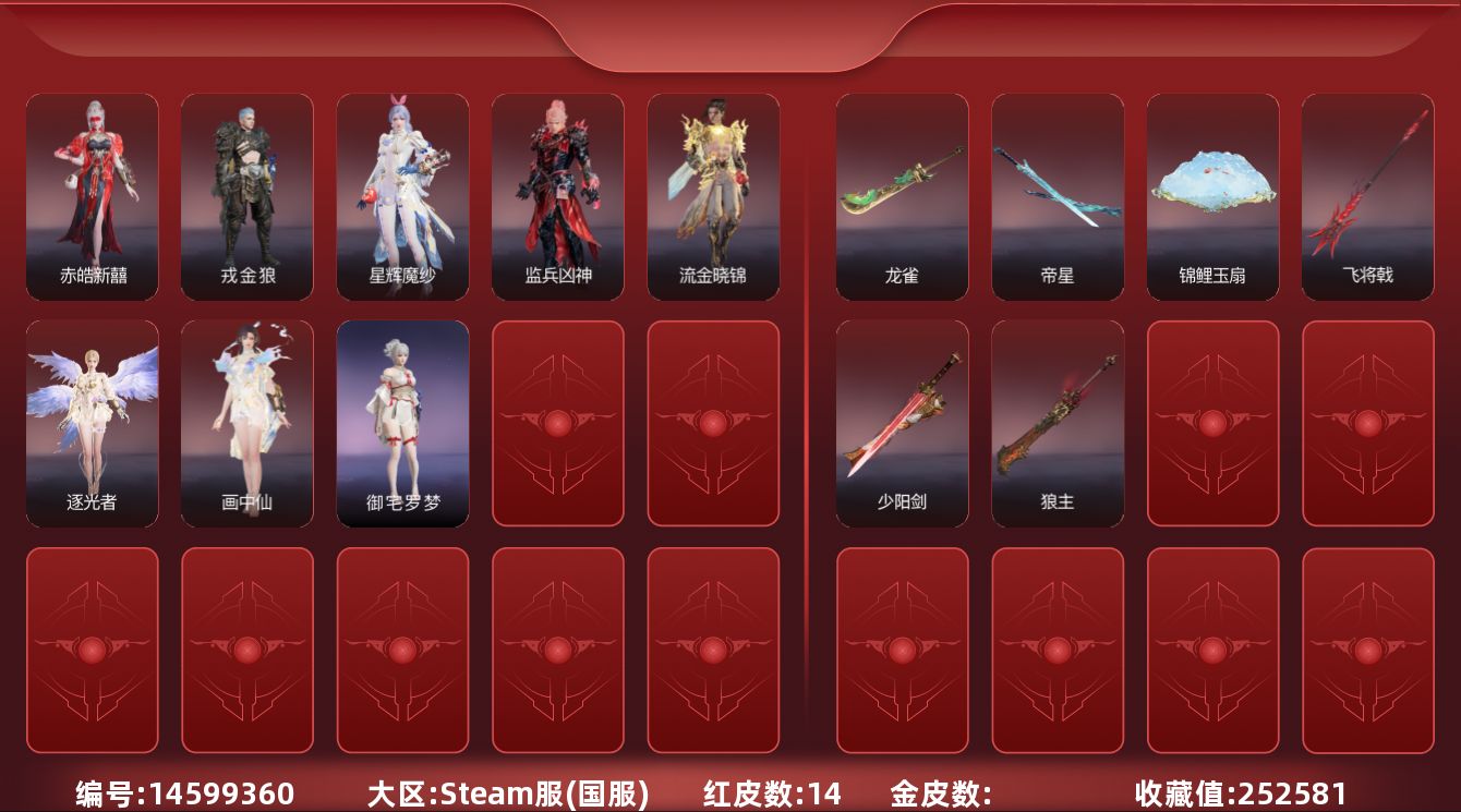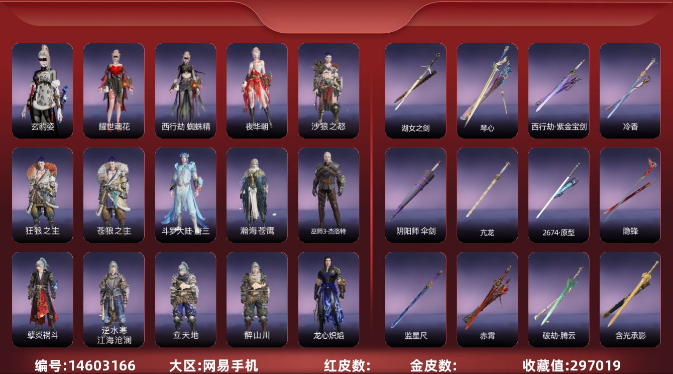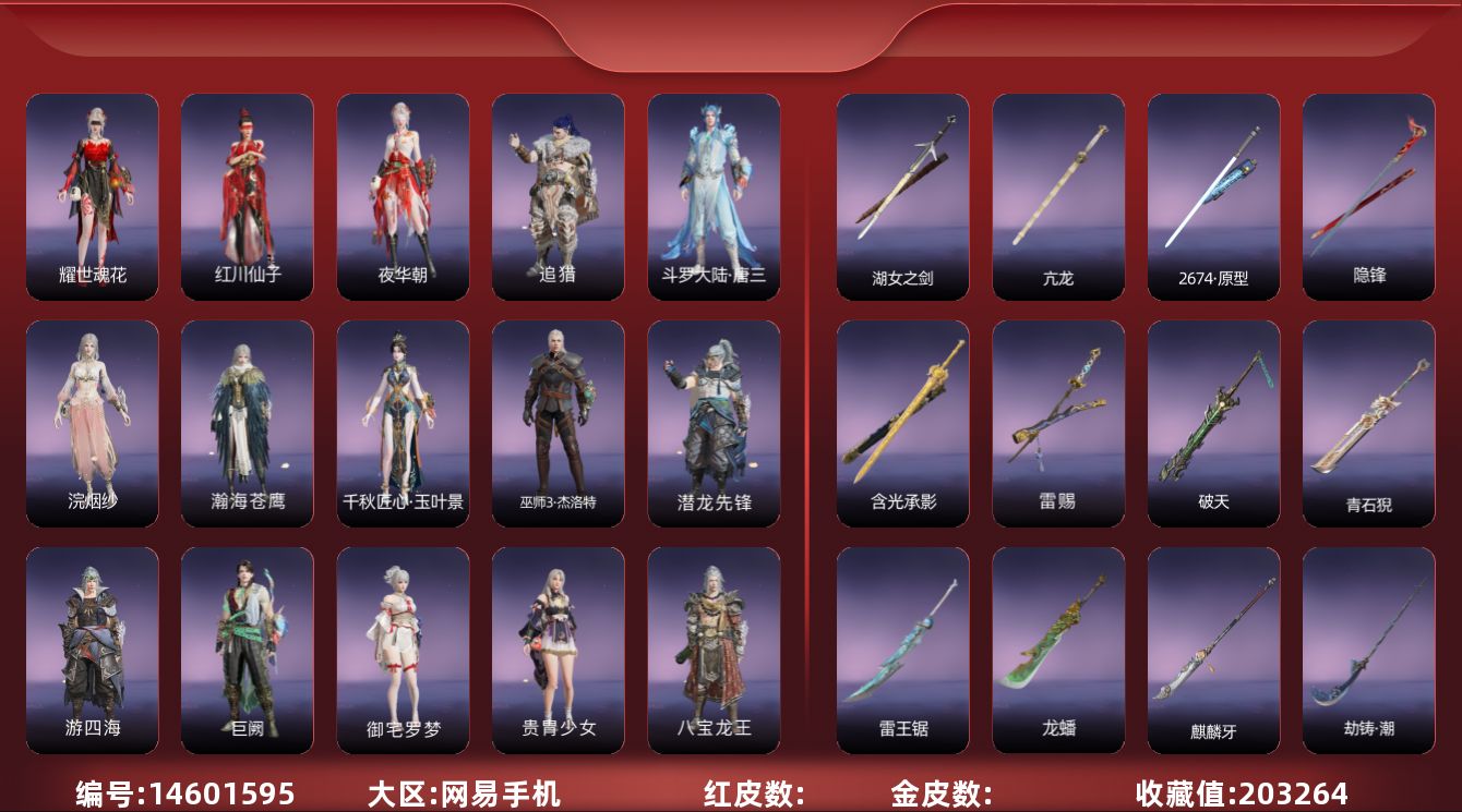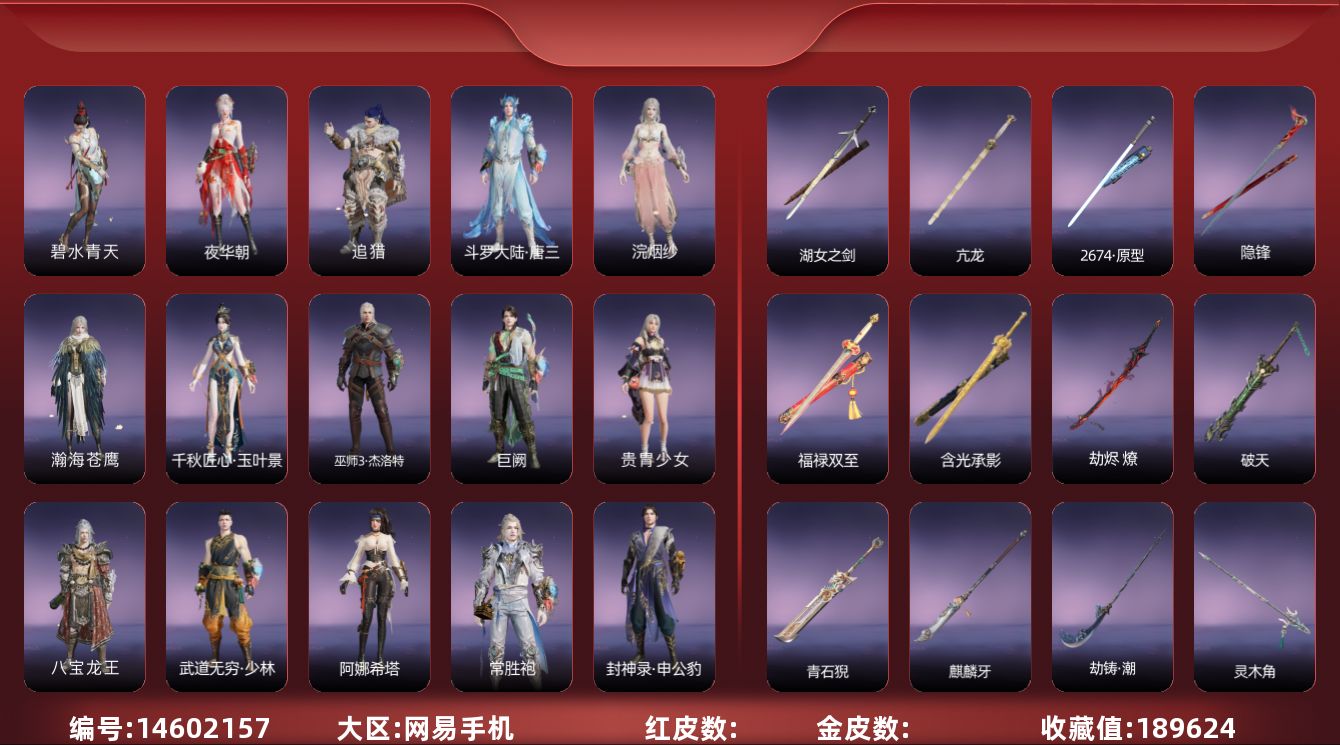 [14602157]p5621/可换绑/等级249/s18三人黄金4/11红234金收藏值189624/|等级249|陨星3215|幻丝263722|金砖690|通行证lv.63/红色神品:/赤皓新囍宁红夜皮肤/熛怒炼火季沧海皮肤/蝶梦胡桃皮肤/墨离飞索皮肤/执明神君魏轻皮肤/画中仙蓝梦皮肤/毕方弓箭皮肤/麒麟魄拳刃皮肤/少阳剑长剑皮肤/锦鲤玉扇扇皮肤/角色金色皮肤:/夜华朝/碧水青天/绿野守护·悠竹萌客/武道无穷·少林/八宝龙王/智绘·萍之缘/斗罗大陆·唐三/追猎/巫师3·杰洛特/巨阙/贵胄少女/妖刀姬/绿野守护·暗沼摩罗/阿娜希塔/开辟鸿蒙·金戈止/常胜袍/封神录·申公豹/紫微星命/封神录·龙吉公主/赤丹朱湛/千秋匠心·玉叶景/浣烟纱/瀚海苍鹰/福瑞天泽/葫芦兄弟·蛤蟆头领/干将莫邪/护世四法·持国天王/封神录·妲己/日影花阴/夜绸袍/封神录·姜子牙/绿野守护·山漠狞影/雪铃绮歌/发型金色皮肤:/簪缨宁红夜发型/绿野守护·娇憨沈妙发型/缘觉天海发型/斗罗大陆·海神特木尔发型/逆水寒·江海季沧海发型/含锋季沧海发型/巫师3·白狼发/月丹胡桃发型/绿野守护·冷傲崔三娘发型/【挑染】羽客无尘发型/封神录·红鸾星顾清寒发型/排霜发/千秋匠心·琳琅迦南发型/幽焰季莹莹发型/缱绻季莹莹发型/封神录·笼烟芍药玉玲珑发型/秀逸胡为发型/封神录·仙风刘炼发型/【挑染】风吹雪刘炼发型/蜜语发/武器金色皮肤:/咕咕/天牛翼/绿野守护·雨幕/引冰落/萤火/雪国礼炮/钻山/竹霹雳/错误2/心魔/乌木弓/豹胎易筋弓/腥红之月/阴阳师·雅矢/莲心剑雨/绿野守护·毛乎乎/天狐/2674·原型/巫师3·湖女之剑/亢龙/隐锋/福禄双至/含光承影/劫烬·燎/白鹿/烛泪/青石猊/破天/麒麟牙/劫涛·潮/灵木角/长虹/建木/武道无穷·封魔/学宫之杖/打狗棒/曼提柯尔之牙/桡尺刀/仙舞/华夏神兵·马首刀/腾云歌/耀夜流华/千堆雪/咯咯/夔牛槌/嘶风/除岁/镇魔杵/精武/空寒/蛋仔派对·咸鱼/怨憎/西摩格镰/饰品金色皮肤:真的抱歉/雁落笠/魂花耀/昆仑龙神冠/竞无间·女/美团·团上头了/植物大战僵尸2·脑子给我/粽香远/绿野守护·绒绒猫/巫师3·驴耳朵/甲辰龙/福虎帽/安歌帽/兔尾/葫芦兄弟·蛤蟆头/街头狂欢·制胜之道/