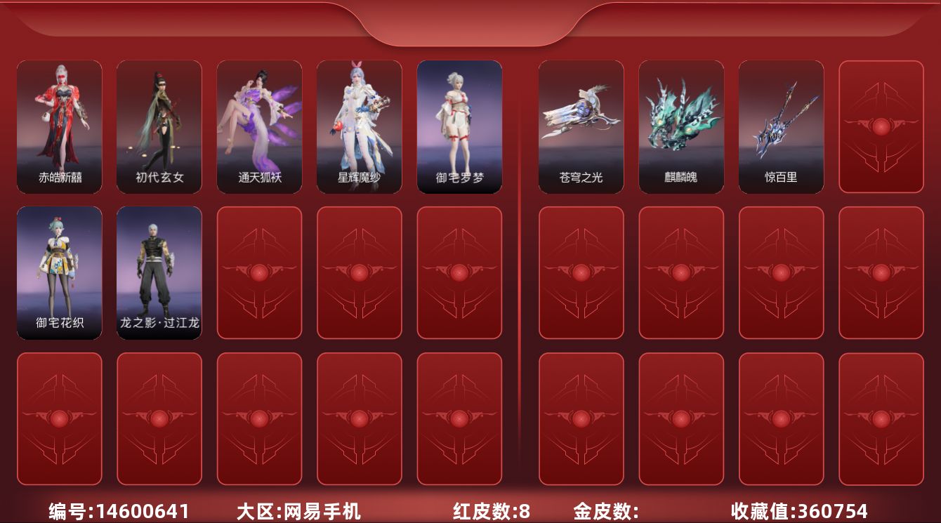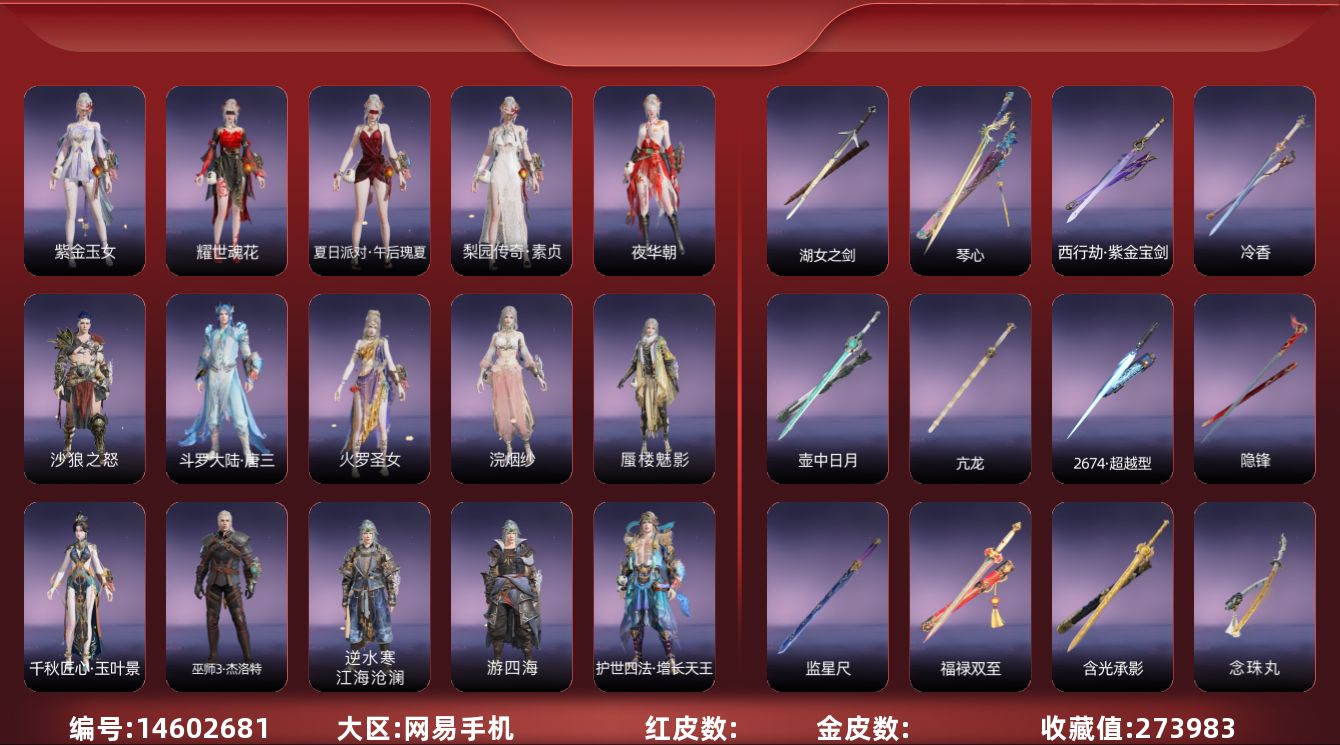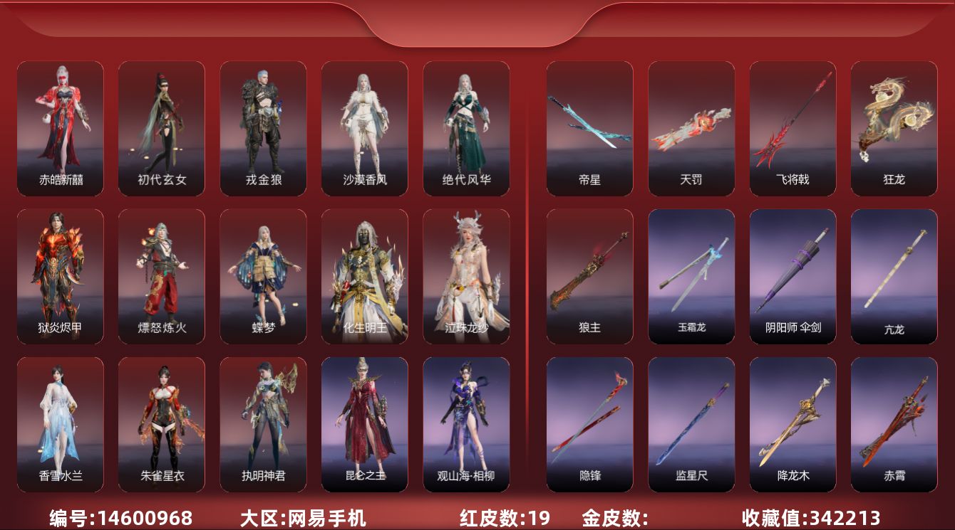 [14600968]0acylp网易手机19个红皮泳装2个【半夏晚风(魏轻),盛夏白阳(季莹莹),】奥义特效5个【神君印(岳山),炎烈珠(季沧海),初代机(沈妙),珥冰(天海),彩佣娃娃(妖刀姬),】小技能特效1个【剪纸·彩刀(妖刀姬),】武器红皮5个【帝星,飞将戟,狂龙,狼主,天罚,】网易年超限,等待换绑期间可以登入网易大神直接进入游戏不影响游戏体验。网易支付未实名道具货币都是默认已使用.其他红皮14个【狱炎烬甲,执明神君,赤皓新囍,化生明王,泣珠龙纱,墨离,香雪水兰,朱雀星衣,沙漠香风,蝶梦,初代玄女,戎金狼,绝代风华,熛怒炼火,】劫涛·潮,玄豹姿,唐三,龙心炽焰,新魔杰·斩魔天将,巨阙,紫金玉女,夜华朝,护世四法·多闻天王,惊云羽,火罗圣女,神鹰之女,千秋匠心·玉叶景,长歌诗韵·遣唐使,守誓者,掌珠仙子,金羽客,司天命,逆水寒·极夜天曦,寒英素雪,寒烟素,新倩女幽魂·流纨裙,观山海·冬神玄冥,护世四法·持国天王,干将莫邪,观山海·秋神蓐收,黄昏巫主,日影花阴,护世四法·广目天王,夜绸袍,绮云衫,劫涛·潮,葫芦兄弟·蛤蟆头领,封神录·申公豹,封神录·姜子牙,观山海·相柳,观山海·精卫,铸神·天禄瑞光,梨园传奇·丽娘,封神录·哪吒,羽影