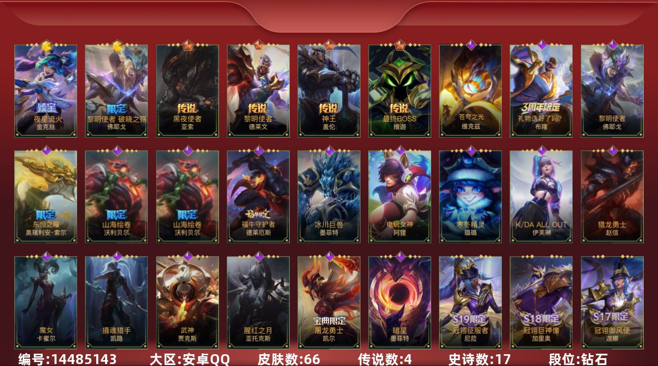 2神话 1限定 4传说 17史诗 66皮肤 可二次 可修改实名 【段位】:钻石 【神话皮】:夜星流火 金克丝黎明使者 破晓之殇 佛耶戈 【限定皮肤】:山海绘卷狗熊 【传说皮】:黎明使者德莱文神王盖伦黑夜使者亚索最终boss维迦