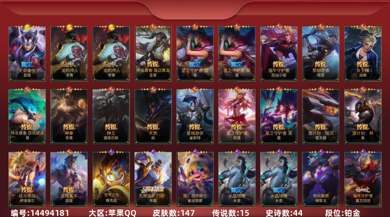 2神话 4限定 15传说 44史诗 147皮肤 可二次 可修改实名 【段位】:铂金 【神话皮】:天命豪侠 瑟提龙的传人 【限定皮肤】:龙的传人星之守护者霞星之守护者洛水晶玫瑰永恩 【传说皮】:灵魂莲华腕豪神龙尊者 昼日真龙 亚索天煞劫神王诺手神拳盲僧神龙尊者 驭风啸龙星域游侠卡