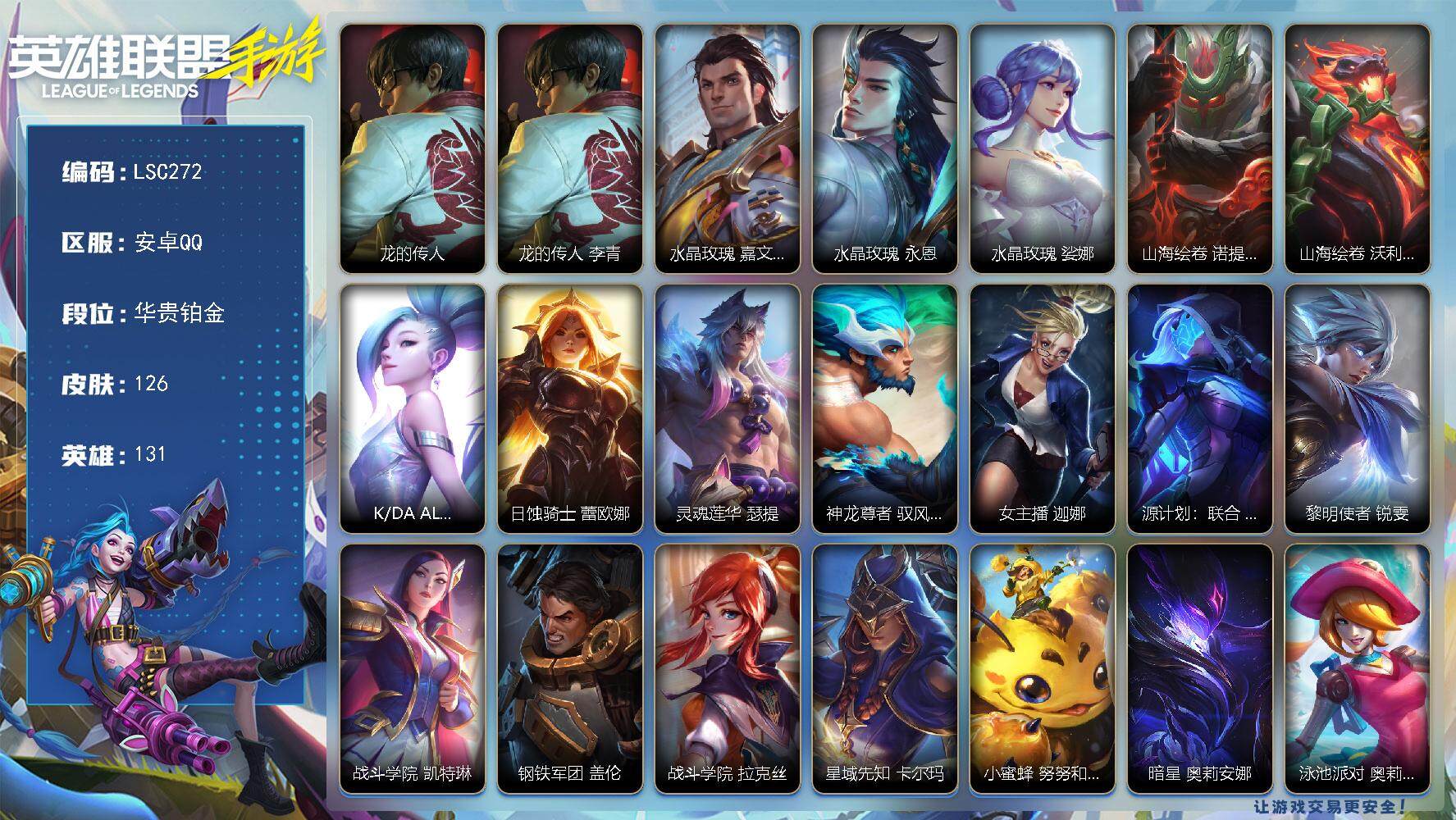 【lsc272】131英雄/126皮肤/1神话/8传说/50史诗/华贵铂金/龙的传人 李青/水晶玫瑰 嘉文四世/水晶玫瑰 永恩/水晶玫瑰 娑娜/山海绘卷 诺提勒斯/山海绘卷 沃利贝尔/k/da all out 萨勒芬妮/日蚀骑士 蕾欧娜/灵魂莲华 瑟提/神龙尊者 驭风啸龙 易/女主播 迦娜/源计划:联合 艾希/黎明使者 锐雯/战斗学院 凯特琳/钢铁军团 盖伦/战斗学院 拉克丝/星域先知 卡尔玛/小蜜蜂 努努和威朗普/暗星 奥莉安娜/泳池派对 奥莉安娜/恶魔之刃 泰达米尔/斗魂无双 赵信/霸天异形 卡兹克/暗星 卡兹克/末路管家 布隆/礼物选好了吗? 布隆/东恒之曜 奥瑞利安·索尔/腥红之月 崔斯特/弹幕天使 卡莎/源计划:风 亚索/幻梦甜心 阿狸/源计划:阴 劫/灵能特工 劫/武神 贾克斯/未来战士 卢锡安/大魔王 提莫/灵魂莲华 提莫/小蜜蜂 提莫/电玩女神 娑娜/泳池派对 璐璐/驯龙女巫 璐璐/银河魔装机神 希瓦娜/太空律动 “百万调音” 格温/星域审判官 卡蜜尔/地下拳王 李青/电玩上校 库奇/奈落之炎 凯南/龙腾虎跃 瑟提/心之钢 瑟提/魅惑女巫 迦娜/银河魔装机神 菲兹/绒毛 菲兹/欧米伽小队 鬼影蛙人 菲兹/光明哨兵 艾瑞莉娅/秘旅探索者 加里奥/猎龙勇士 奥拉夫/泳池派对 凯特琳/西部魔影 锤石/盗梦暗影 锤石/s1光耀之刃/s2光耀之芒/s3光耀之灵/s4光耀之心/s5绯金魅影/s6绯金丽刃/s7绯金战斧/s8绯金鮫灵/s9王牌舰长/s10王牌上将/s11王牌勇将/s11王牌司令/s12龙冕先锋/s13龙冕御盾/s14龙冕神策/s15龙冕异士/s17冠翎御风使/s18冠翎巨神像/s19冠翎征服者/小小骑士 阿木木/暗黑武士 雷恩加尔/斗战胜佛 孙悟空/时之砂 艾克/光耀之心 奥莉安娜/光耀之刃 泰达米尔/秘密特工 赵信/龙冕先锋 赵信/光耀之芒 金克丝/双城之战 金克丝/龙冕御盾 布隆/龙冕异士 烬/探戈灵魂 崔斯特/王牌舰长 崔斯特/冠翎征服者 尼菈/刀锋女王 莫甘娜/绯金魅影 伊芙琳/钢铁意志 潘森/银色之牙 阿卡丽/超武乾坤:暗影 阿卡丽/皇家守卫 菲奥娜/绯金丽刃 菲奥娜/擂台皇帝 布里茨/小红帽 安妮/焰尾妖狐 阿狸/冲击之刃 劫/光明骑士 贾克斯/末世天使 凯尔/烧烤女神 蕾欧娜/熊猫 提莫/五连摇滚键盘手 娑娜/甜心宝贝 娑娜/缪斯女神 娑娜/邪恶女巫 璐璐/光耀之灵 璐璐/冰霜亚龙 希瓦娜/铁拳执事 蔚/女警官 蔚/孤胆英豪 嘉文四世/王牌上将 嘉文四世/腥红之月 凯南/战争血统 蒙多医生/熔火之心 拉莫斯/制胜金球 拉莫斯/单身贵族 内瑟斯/西部牛仔 厄运小姐/抵抗军战姬 厄运小姐/暗影 易/热血班长 德莱厄斯/冠翎御风使 迦娜/德莱德莱 德莱文/绯金战斧 德莱文/王牌司令 艾希/哞利斯塔 阿利斯塔/无畏号 墨菲特/黑曜石守护者 墨菲特/龙冕神策 吉格斯/绯金鲛灵 娜美/海贼魅影 卡特琳娜/光执事 伊泽瑞尔/风执事 加里奥/冠翎巨神像 加里奥/黑暗骑士 奥拉夫/王牌勇将 奥拉夫/铁血狙击手 凯特琳/黑暗骑士 布兰德/鳄霸 雷克顿