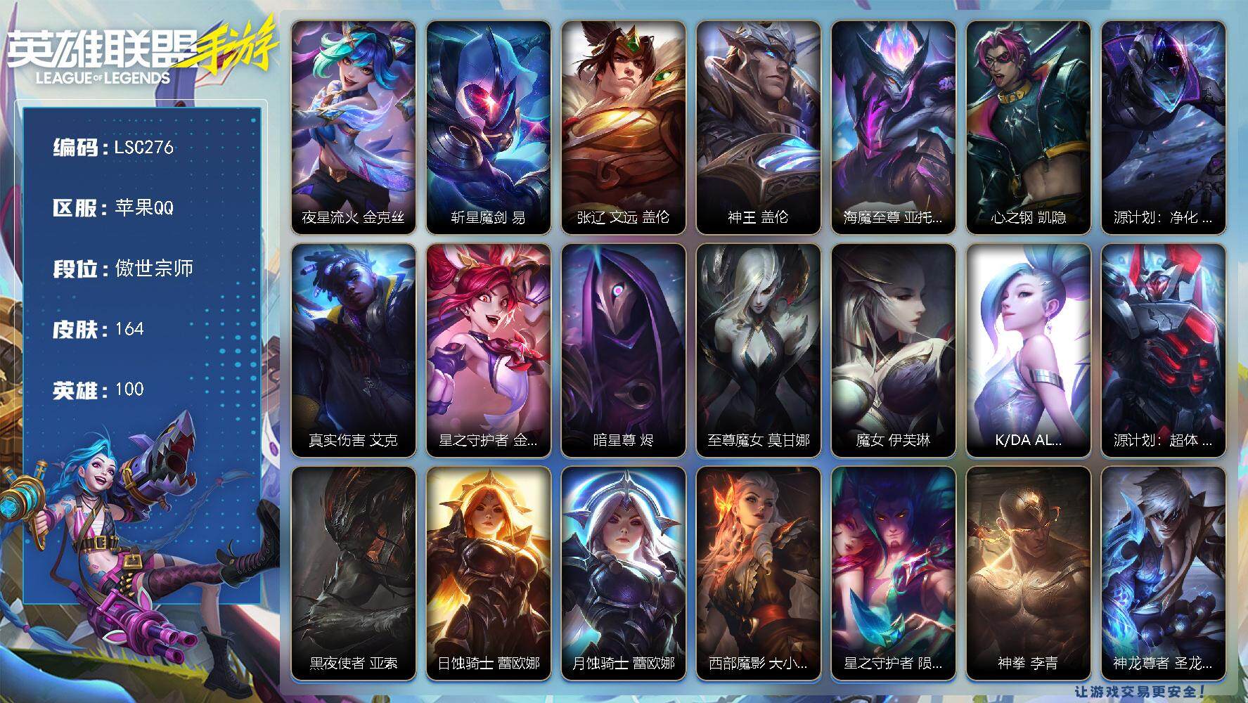 【lsc276】100英雄/164皮肤/2神话/23传说/83史诗/傲世宗师/夜星流火 金克丝/斩星魔剑 易/张辽 文远 盖伦/神王 盖伦/海魔至尊 亚托克斯/心之钢 凯隐/源计划:净化 薇恩/真实伤害 艾克/星之守护者 金克丝/暗星尊 烬/至尊魔女 莫甘娜/魔女 伊芙琳/k/da all out 萨勒芬妮/源计划:超体 莫德凯撒/黑夜使者 亚索/日蚀骑士 蕾欧娜/月蚀骑士 蕾欧娜/西部魔影 大小姐 蕾欧娜/星之守护者 陨 洛/神拳 李青/神龙尊者 圣龙 李青/灌篮高手 德莱厄斯/西部天使 艾希/双城之战:殊途 杰斯/源计划:泯灭 雷克顿/暗星 锤石/霸天剑魔 亚托克斯/腥红之月 亚托克斯/睡衣守护者 拉克丝/摄魂猎手 凯隐/雷喵喵尔 雷恩加尔/丧尸 努努和威朗普/地狱行者 孙悟空/腥红之月 黛安娜/恶魔之刃 泰达米尔/暗星 卡兹克/末路管家 布隆/礼物选好了吗? 布隆/星之守护者 辛德拉/电玩女神 卡莎/k/da all out 卡莎/k/da all out 伊芙琳/铁血女忍 阿卡丽/k/da all out 阿卡丽/泳池派对 菲奥娜/未来战士 菲奥娜/海之歌 萨勒芬妮/歌手?不!是主唱! 萨勒芬妮/古神 莫德凯撒/银河魔装机神 安妮/灵魂莲华 亚索/k/da all out 阿狸/源计划:阴 劫/武神 贾克斯/深海奇域 凯尔/未来战士 卢锡安/小恶魔 崔丝塔娜/大魔王 提莫/小蜜蜂 提莫/泳池派对 璐璐/驯龙女巫 璐璐/星之守护者 璐璐/太空律动 “节奏幻师” 璐璐/破败军团 希瓦娜/欧米伽小队 毒针狙击手 图奇/太空律动 “百万调音” 格温/星域裁断使 格温/魔女 卡蜜尔/暗星 嘉文四世/地下拳王 李青/冰封王子 蒙多医生/源计划:燃 泽丽/灵魂莲华 永恩/心之钢 永恩/西部魔影 德莱厄斯/禁卫机甲 格雷福斯/玉剑传说 风仙子 迦娜/灵魂收割者 德莱文/破败军团 德莱文/斗魂无双 德莱文/银河魔装机神 纳尔/神龙尊者 苍龙 艾希/水晶玫瑰 艾希/欧米伽小队 鬼影蛙人 菲兹/未来战士 锐雯/玉剑传说 武剑仙 锐雯/白色死神 韦鲁斯/满弓镇魂 韦鲁斯/死亡誓约 卡特琳娜/战斗学院 卡特琳娜/西部魔影 执行人 卡特琳娜/星之守护者 索拉卡/源代码 索拉卡/星之守护者 伊泽瑞尔/战斗学院 阿克尚/战地机甲 厄加特/猎龙勇士 奥拉夫/泳池派对 凯特琳/苍穹之光 布兰德/泳池派对 雷克顿/黯晶巨鳄 雷克顿/欧米伽小队 天雷爆破手 维迦/真实伤害 赛娜/神龙尊者 钢铁之龙 锤石/梦游仙境 莉莉娅/星域巫灵 薇古丝/红帽迷影 薇古丝/s1光耀之刃/s2光耀之芒/s3光耀之灵/s4光耀之心/s5绯金魅影/s6绯金丽刃/s7绯金战斧/s9王牌舰长/s10王牌上将/s11王牌勇将/s12龙冕先锋/s13龙冕御盾/s14龙冕神策/s15龙冕异士/s17冠翎御风使/s18冠翎巨神像/s19冠翎征服者/海上霸主 盖伦/暗黑武士 雷恩加尔/光明骑士 卡尔玛/脏兮兮 努努和威朗普/斗战胜佛 孙悟空/苍穹之光 薇恩/猎龙勇士 薇恩/时之砂 艾克/哥特女仆 奥莉安娜/光耀之心 奥莉安娜/暗黑女武神 黛安娜/光耀之刃 泰达米尔/秘密特工 赵信/龙冕先锋 赵信/死亡绽放 卡兹克/末路狂花 金克丝/光耀之芒 金克丝/龙冕御盾 布隆/龙冕异士 烬/赌侠 崔斯特/王牌舰长 崔斯特/冠翎征服者 尼菈/绯金魅影 伊芙琳/绯金丽刃 菲奥娜/擂台皇帝 布里茨/西部牛仔 亚索/光明骑士 贾克斯/游击队员 崔丝塔娜/兔宝宝 提莫/熊猫 提莫/光耀之灵 璐璐/女警官 蔚/王牌上将 嘉文四世/至高之拳 李青/超级英雄 凯南/超武乾坤:电弧 凯南/战争血统 蒙多医生/制胜金球 拉莫斯/单身贵族 内瑟斯/西部牛仔 厄运小姐/末路教父 格雷福斯/冠翎御风使 迦娜/金牌主播 德莱文/绯金战斧 德莱文/极地女神 艾希/兔宝宝 菲兹/龙冕神策 吉格斯/碎桶者 古拉加斯/莲花之令 艾瑞莉娅/风执事 加里奥/冠翎巨神像 加里奥/光明之锤 杰斯/王牌勇将 奥拉夫/黑暗骑士 布兰德/枯萎之壤 雷克顿/鳄霸 雷克顿