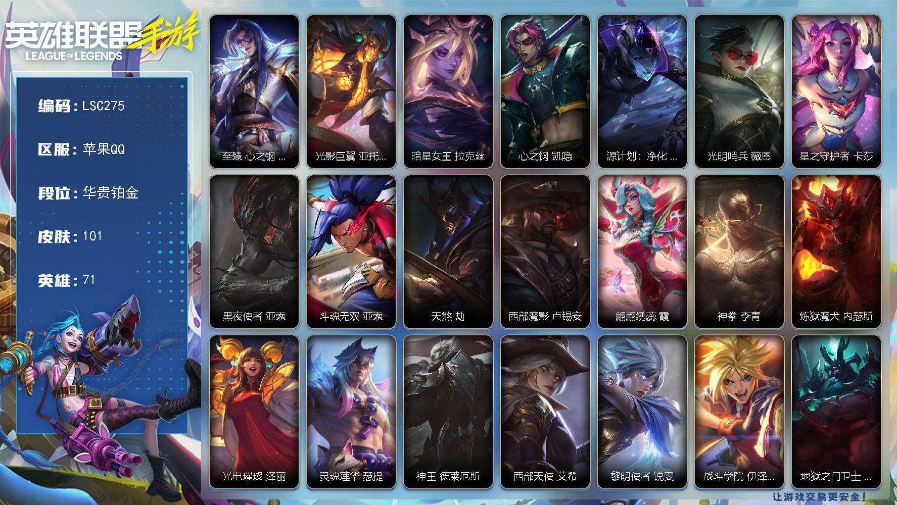 【lsc275】71英雄/101皮肤/1神话/24传说/45史诗/华贵铂金/至臻 心之钢 永恩/光影巨翼 亚托克斯/暗星女王 拉克丝/心之钢 凯隐/源计划:净化 薇恩/光明哨兵 薇恩/星之守护者 卡莎/黑夜使者 亚索/斗魂无双 亚索/天煞 劫/西部魔影 卢锡安/翩翩绣蕊 霞/神拳 李青/炼狱魔犬 内瑟斯/光电璀璨 泽丽/灵魂莲华 瑟提/神王 德莱厄斯/西部天使 艾希/黎明使者 锐雯/战斗学院 伊泽瑞尔/地狱之门卫士 加里奥/斗魂觉醒 莎弥拉/未来战士 凯特琳/战斗学院 凯特琳/源计划:毁灭 派克/霸天剑魔 亚托克斯/劲道美味 阿木木/斗魂无双 赵信/猎梦吞噬者 卡兹克/战斗校长 悠米/末路管家 布隆/东恒之曜 奥瑞利安·索尔/斗魂无双 尼菈/k/da all out 伊芙琳/星之守护者 萨勒芬妮/银河魔装机神 安妮/战场之王 亚索/电玩女神 阿狸/屠龙勇士 凯尔/战斗学院 蕾欧娜/泳池派对 璐璐/永恒之森 霞/欧米伽小队 毒针狙击手 图奇/源代码 卡蜜尔/魔女 卡蜜尔/电玩上校 库奇/星之守护者 厄运小姐/斗魂无双 德莱文/神龙尊者 苍龙 艾希/海之歌 艾希/霸天巨兽 墨菲特/冰川巨兽 墨菲特/暗星 墨菲特/柚子软糖 菲兹/灵魂莲华 锐雯/暗星 韦鲁斯/玉剑传说 舞剑仙 艾瑞莉娅/光明哨兵 艾瑞莉娅/斗魂无双 艾瑞莉娅/源代码 索拉卡/电玩勇者 伊泽瑞尔/西部魔影 持呛女巫 莎弥拉/猎龙勇士 奥拉夫/灵魂烈焰 布兰德/战场之王 布兰德/黯晶巨鳄 雷克顿/欧米伽小队 天雷爆破手 维迦/冰糖葫芦 维迦/斗魂觉醒 卡莉丝塔/s1光耀之刃/s7绯金战斧/s9王牌舰长/s11王牌司令/s12龙冕先锋/s13龙冕御盾/s14龙冕神策/s15龙冕异士/s18冠翎巨神像/光明骑士 卡尔玛/国王 泰达米尔/光耀之刃 泰达米尔/秘密特工 赵信/龙冕先锋 赵信/双城之战 金克丝/龙冕御盾 布隆/龙冕异士 烬/王牌舰长 崔斯特/冰霜烈焰 安妮/偶像歌手 阿狸/兔宝宝 提莫/邪恶女巫 璐璐/黯黑魔龙 希瓦娜/女警官 蔚/双城之战:破枷 蔚/超级英雄 凯南/战争血统 蒙多医生/熔火之心 拉莫斯/单身贵族 内瑟斯/西部牛仔 厄运小姐/绯金战斧 德莱文/黑暗骑士 艾希/王牌司令 艾希/黑曜石守护者 墨菲特/科学狂人 吉格斯/龙冕神策 吉格斯/迅箭 韦鲁斯/光执事 伊泽瑞尔/冠翎巨神像 加里奥/黑暗骑士 奥拉夫