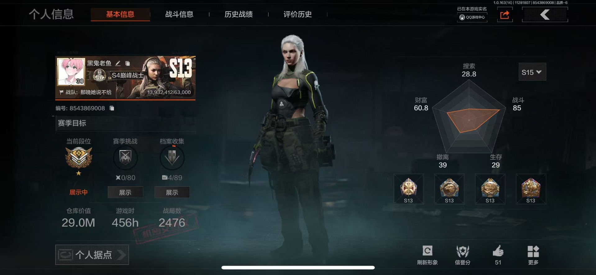 库存价值29 4近战武器 1金套装 2金呛皮 可修改实名 【柯恩币数量】:14321 【角色装扮(金)】:火绒·塔莉娅 【近战武器】:s-07折刀赢家匕首工兵铲冬日冰镐 【金色呛皮】:旗帜·aek棱光裂变·qbu191 【紫色呛皮】:武侍·sj16棱光裂变·ace31棱光裂变·ak7