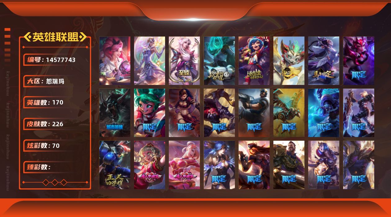 【ld4453】71英雄/83皮肤/1神话/11限定/5炫彩/8传说/20史诗/未定级/至臻飞升战神潘森/王国机神白虎贾克斯/圣诞糖果棒厄运小姐/圣诞老人古拉加斯/冠军典狱长锤石/暗杀星奥莉安娜/sktt1阿利斯塔/sktt1扎克/ssg伊泽瑞尔/鬼影重重魔腾/泳池派对雷克顿/钢铁之翼艾尼维亚/战场女武神凯尔/约德尔国队长提莫/驯龙炮手崔丝塔娜/女皇艾希/黯晶凤凰艾尼维亚/腥红之月鬼武姬阿卡丽/神王盖伦/天煞劫/屠龙勇士赵信/战场公主希维尔/月光女神阿忒弥斯索拉卡/熊猫提莫/少林武僧贾克斯/小小骑士阿木木/寒冰女皇迦娜/绝代智将斯维因/无畏号墨菲特/龙骑统帅嘉文四世/银色之牙阿卡丽/刺客信条凯南/战国大名慎/银河魔装机神希瓦娜/皇家守卫菲奥娜/夜鸦菲奥娜/源代码丽桑卓/野火之藤婕拉/五星大厨塔姆/糖果之王艾翁/创意工坊黑默丁格/宗师级锻造训练师/幽蓝梦魇加里奥/学生会长弗拉基米尔/五杀摇滚女声主唱凯尔/荒野镖客阿利斯塔/后场堡垒阿利斯塔/黯晶巨牛阿利斯塔/星之守护者索拉卡/勇敢的心艾希/勇敢的心泰达米尔/冰球队员贾克斯/地狱厨房莫甘娜/探戈灵魂伊芙琳/狂欢阿木木/情绪摇滚阿木木/铬金铠甲拉莫斯/先驱行者卡萨丁/幽灵船长普朗克/日冕女神卡尔玛/创世之神特朗德尔/恶灵布偶奥莉安娜/摩登骇客薇恩/蛇发女妖卡西奥佩娅/这货不是乌迪尔/宇航员波比/美酒节特使古拉加斯/龙骑士莫德凯撒/苍穹之光约里克/刺身之拳阿卡丽/毛毛虫克格莫/炎爆慎/游侠法师拉克丝/野兽女王瑟庄妮/死亡骑士瑟庄妮/玉剑传说无双/未来战士菲奥娜/糖果女巫璐璐/暗星女王丽桑卓/布隆狮心/腥红之月亚托克斯/弗雷尔卓德塞拉斯/怨之砂派克