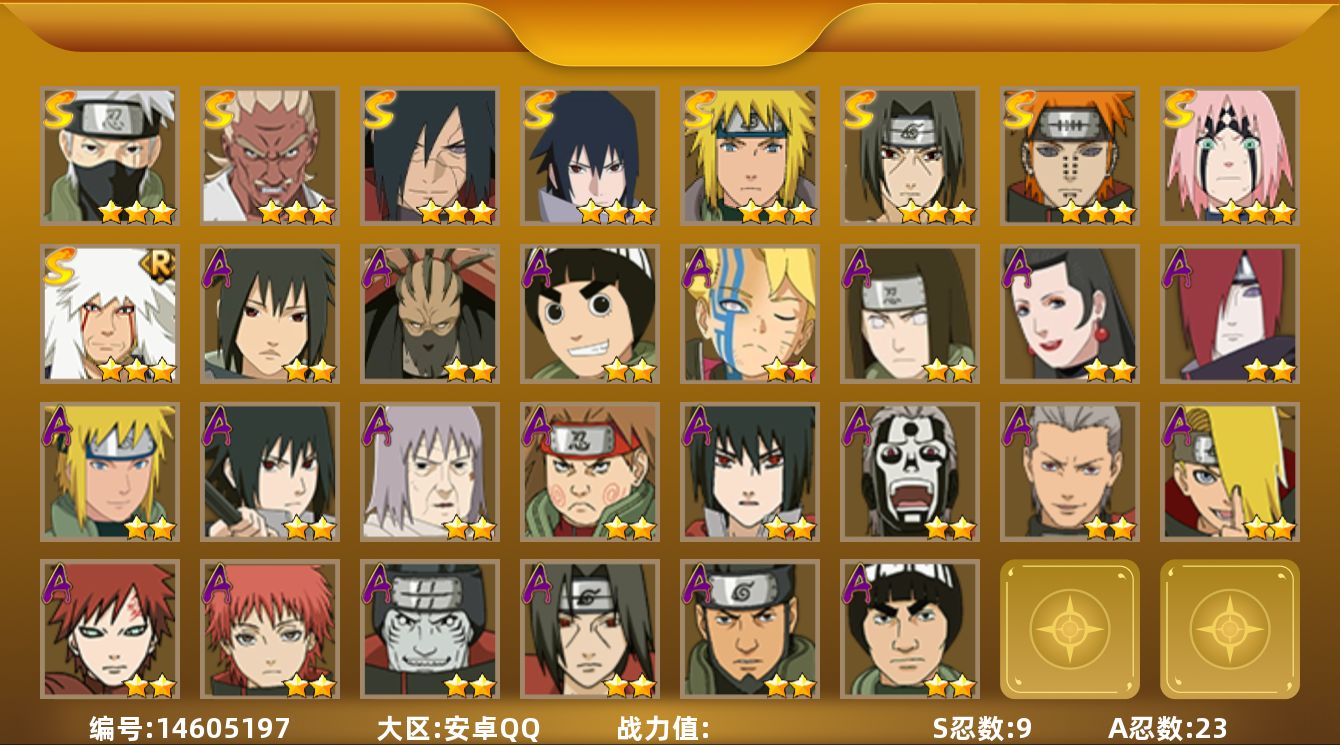 [5709487]可二次修改-安卓q区 145级 1056万战斗力 v10 156忍者 17名s忍 九喇嘛鸣人 忍战樱 万花筒佐助 豪杰自来也 大蛇丸 纲手 八门凯 波风水门 秽土柱间 木叶创立柱间 秽土斑 木叶创立斑 忍战带土 红夜面具男 忍战大野木 天道佩恩 大筒木金式(猿飞日斩90碎片 秽土斑解89碎片) 28名a忍 59名b忍 52名c忍