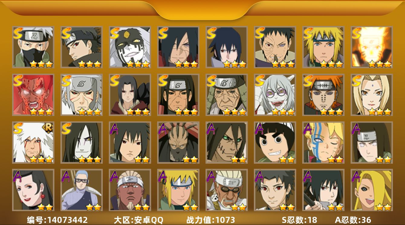 [14073915]【编号09066】【店长推荐精品号】12s级忍者数-17a级忍者数 【s级忍者】:猿飞日斩「秽土转生」3星,艾「忍界大战」3星,宇智波止水「须佐能乎」3星,旗木卡卡西「须佐能乎」3星,自来也「舞之豪杰」3星,波风水门3星,神秘面具男「红夜之刃」3星,漩涡鸣人「九喇嘛连结」3星,佩恩「天道」3星,宇智波佐助「永恒万花筒」3星,宇智波斑 「白面具」3星宇智波斑「白面具」,大筒木金式3星 【a级忍者】:波风水门「青年」2星,迪达拉2星,飞段「死司凭血」2星,干柿鬼鲛4星,漩涡博人「桃式显现」2星,迈特凯5星,我爱罗「疾风传」3星,蝎2星,猿飞阿斯玛5星,宇智波鼬2星,宇智波佐助「须佐能乎」2星,长十郎「六代目水影」2星,李洛克「忍界大战」2星,黑土「博人传」2星,秋道丁次「忍界大战」2星,千代「近松十人卫」2星,不缘2星