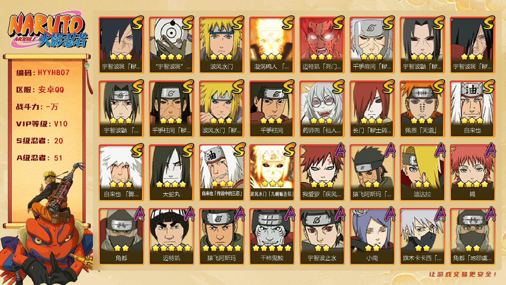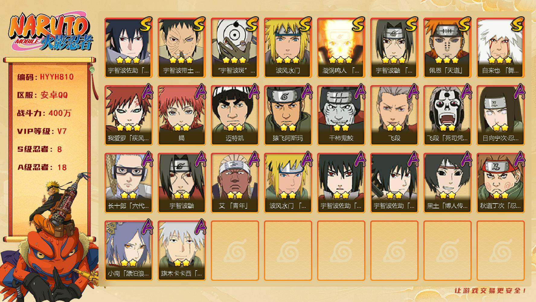 【hyyh784】v7/战力400w/s忍6/a忍23/2星大野木「侠隐江湖」/3星波风水门「九喇嘛连结」/死司飞段/宇智波鼬/凯/蝎/佩恩/忍战丁次/秽土角都/2星土台「忍界大战」/卑留呼/青年水门/蝎「绯流琥」/豪杰自来也/漩涡鸣人暴怒·第六尾/2星桃地再不斩「秽土转生」/自来也「传说中的三忍」/飞段/神农「羁绊」/猿飞阿斯玛/加藤断/宇智波泉奈/迪达拉/幻之真容旗木卡卡西/鬼鲛/2星迈特