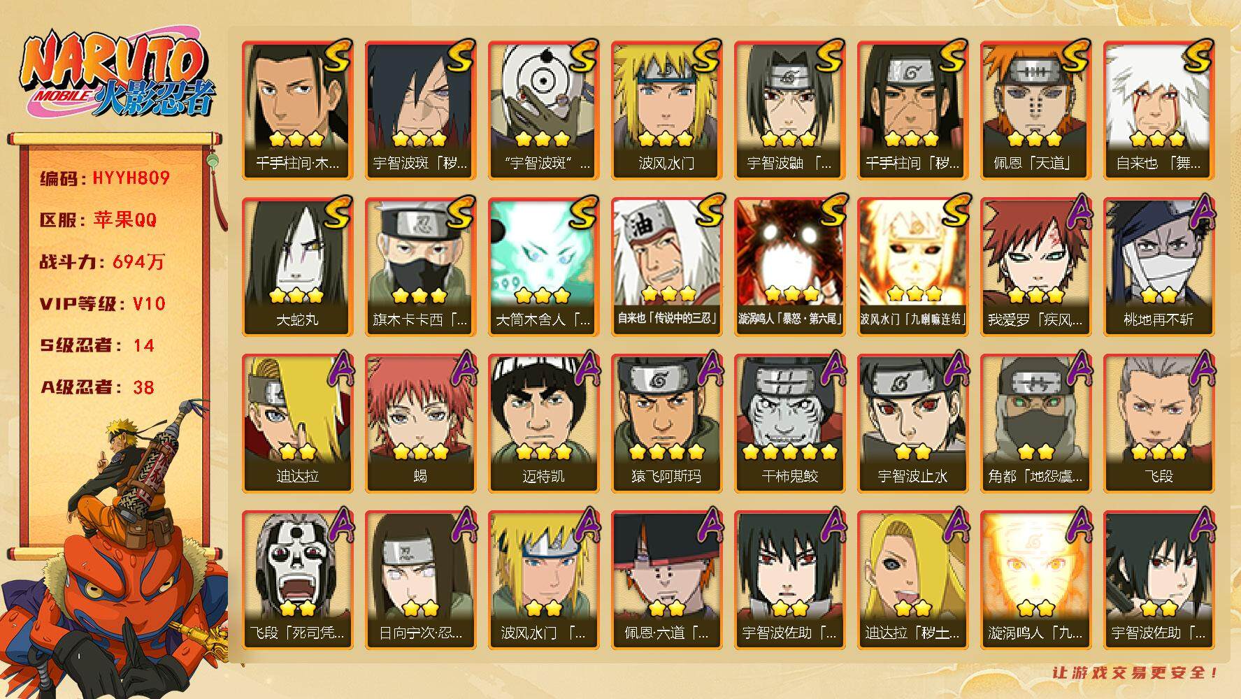 【hyyh805】v8/战力686w/s忍11/a忍34/2星波风水门「新春限定」/2星日向宁次「忍界大战」/2星宇智波带土「漂泊浪客」/2星大野木「侠隐江湖」/2星飞段「死司凭血」/2星宇智波鼬/3星宇智波佐助「永恒万花筒」/3星旗木卡卡西「须佐能乎」/2星蝎/3星猿飞日斩「秽土转生」/3星佩恩「天道」/3星波风水门/2星秋道丁次「忍界大战」/2星角都「秽土转生」/2星漩涡博人「桃式显现」/3星我爱罗「疾风传」/2星李洛克「忍界大战」/2星神秘面具男「忍者之路」/2星长十郎「六代目水影」/2星波风水门「青年」/2星蝎「绯流琥」/3星自来也「舞之豪杰」/3星自来也「传说中的三忍」/2星日向雏田「最终章」/2星奇拉比/2星飞段/2星神农「羁绊」/2星宇智波佐助「万花筒写轮眼」/2星宇智波泉奈/2星迪达拉/2星旗木卡卡西「幻之真容」/3星大蛇丸/3星艾「忍界大战」/3星迈特凯/3星宇智波斑「秽土转生·解」/2星漩涡鸣人「九尾查克拉」/3星猿飞阿斯玛/2星不缘/2星迈特凯「青春爆炸」/2星宇智波佐助「须佐能乎」/2星猿飞木叶丸「博人传」/5星干柿鬼鲛/2星机械鸣人「初始形态」/2星千代「近松十人卫」/3星宇智波鼬「须佐能乎」