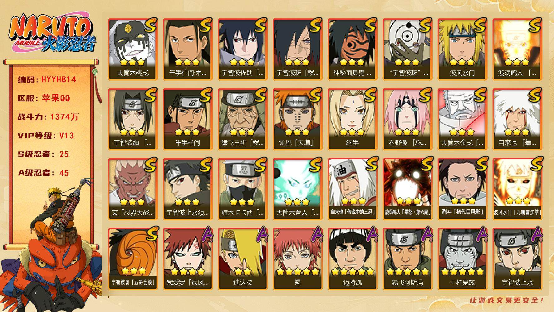 【hyyh814】v13/战力1374w/s忍25/a忍45/2星大野木「侠隐江湖」/3星纲手/2星照美冥「夏日泳装」/3星波风水门「九喇嘛连结」/2星达鲁伊「博人传」/2星飞段「死司凭血」/2星宇智波止水/2星药师兜「侠影江湖」/5星猿飞阿斯玛/3星旗木卡卡西「须佐能乎」/2星猿飞日斩「火影继承人」/3星烈斗「初代目风影」/5星蝎/2星宇智波佐助「侠隐江湖」/3星猿飞日斩「秽土转生」/5星迈特凯/3星千手柱间「木叶创立」/2星神秘面具男「忍者之路」/3星大筒木桃式/2星长十郎「六代目水影」/2星蝎「绯流琥」/3星漩涡鸣人「暴怒·第六尾」/2星桃地再不斩「秽土转生」/3星宇智波斑「白面具」/3星自来也「传说中的三忍」/3星千手柱间/2星佩恩·六道「漂泊浪客」/2星黑土「博人传」/3星宇智波鼬/2星迪达拉「秽土转生」/2星神农「羁绊」/3星春野樱「忍界大战」/2星迪达拉/4星我爱罗「疾风传」/2星小南/2星漩涡鸣人「九尾查克拉」/2星不缘/2星日向宁次「忍界大战」/2星宇智波带土「漂泊浪客」/3星宇智波佐助「永恒万花筒」/3星大筒木金式/2星长门「青年」/3星飞段/3星佩恩「天道」/3星波风水门/3星大筒木舍人「最终章」/3星漩涡鸣人「九喇嘛连结」/2星角都「秽土转生」/2星漩涡博人「桃式显现」/2星小南「夏日泳装」/2星李洛克「忍界大战」/2星卑留呼「火之意志继承者」/2星波风水门「青年」/3星自来也「舞之豪杰」/3星神秘面具男「红夜之刃」/3星宇智波止水「须佐能乎」/2星不风/2星宇智波泉奈/2星旗木卡卡西「幻之真容」/2星巳月「仙人模式」/3星土台「忍界大战」/3星艾「忍界大战」/2星小南「漂泊浪客」/3星宇智波斑「秽土转生·解」/2星迈特凯「青春爆炸」/2星宇智波佐助「须佐能乎」/3星宇智波斑「五影会谈」/5星干柿鬼鲛/2星机械鸣人「初始形态」/3星宇智波鼬「须佐能乎」