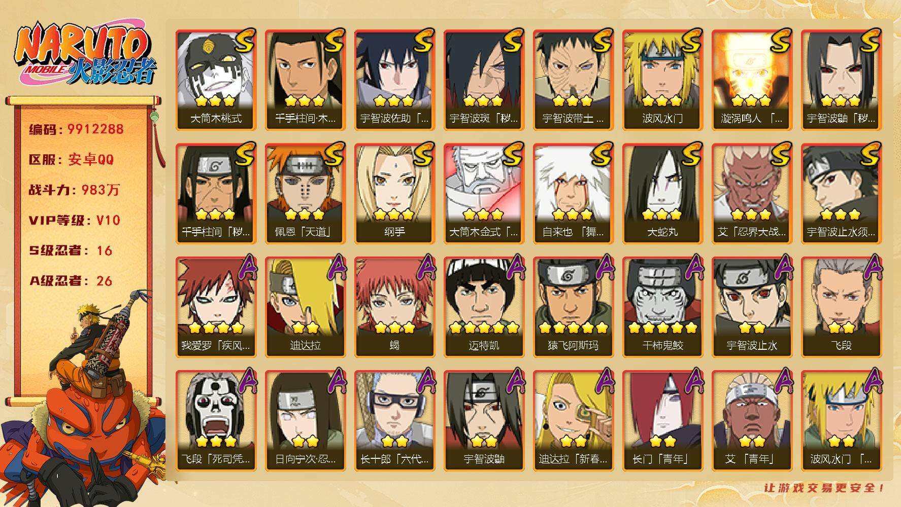 [12754171]【编号27484可秒换绑】【店长推荐捡漏号】16s级忍者数-26a级忍者数 【s级忍者】:千手柱间「秽土转生」3星,宇智波鼬「秽土转生」3星,宇智波斑「秽土转生·解」3星,春野樱「忍界大战」3星,旗木卡卡西「须佐能乎」3星,千手柱间「木叶创立」3星,自来也「舞之豪杰」3星,纲手3星,猿飞日斩3星,波风水门3星,神秘面具男「红夜之刃」3星,漩涡鸣人「九喇嘛连结」3星,佩恩「天道」3星,宇智波佐助「永恒万花筒」3星,宇智波斑 「白面具」3星宇智波斑「白面具」,大筒木桃式3星 【a级忍者】:长门「青年」2星,迪达拉2星,迪达拉「秽土转生」2星,奇拉比「忍界大战」2星,飞段2星,飞段「死司凭血」2星,干柿鬼鲛5星,迈特凯5星,旗木卡卡西「万花筒写轮眼」2星,我爱罗「疾风传」4星,我爱罗「新春限定」2星,蝎3星,小南「新春限定」2星,小南「漂泊浪客」2星,猿飞阿斯玛5星,宇智波鼬2星,宇智波佐助「须佐能乎」2星,照美冥「五代目水影」2星,日向宁次「忍界大战」2星,日向雏田「最终章」2星,长十郎「六代目水影」2星,李洛克「忍界大战」2星,黑土「博人传」2星,秋道丁次「忍界大战」2星,千代「近松十人卫」2星,不缘2星