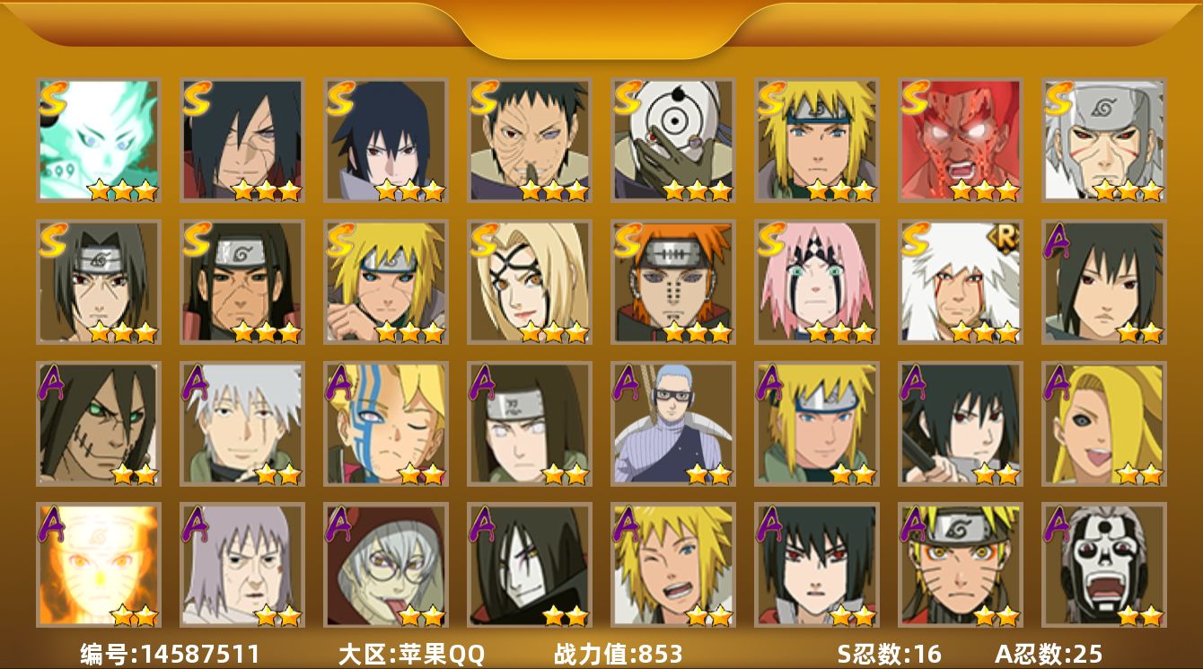 17s忍/32a忍/战力846w/v9/区服1607 【s忍者】 艾「忍界大战」,宇智波佐助「永恒万花筒」,神秘面具男「红夜之刃」,春野樱「忍界大战」,大筒木金式,迈特凯「死门」,宇智波带土「忍界大战」,自来也「舞之豪杰」,宇智波斑「秽土转生」,宇智波斑「白面具」,千手扉间「秽土转生」,猿飞日斩「秽土转生」,长门「秽土转生」,宇智波鼬「须佐能乎」,佩恩「天道」,波风水门,大蛇丸, 【a忍者】 长十