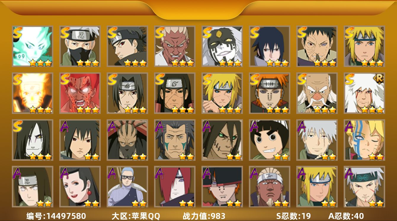 [14497580]v11 19s 40a 983万战力 有熊猫 限时点券2000 天道超56片 秽土鼬49片 zp3295 【s级忍者】:波风水门「秽土转生」3星,千手柱间「秽土转生」3星,大野木「忍界大战」3星,宇智波带土「忍界大战」3星,艾「忍界大战」3星,宇智波鼬「须佐能乎」3星,宇智波止水「须佐能乎」3星,旗木卡卡西「须佐能乎」3星,自来也「舞之豪杰」3星,大蛇丸3星,自来也「传说中的三忍」3星,波风水门3星,漩涡鸣人「九喇嘛连结」3星,迈特凯「死门」3星,佩恩「天道」3星,宇智波佐助「永恒万花筒」3星,大筒木桃式3星,大筒木舍人「最终章」3星,波风水门「九喇嘛连结」3星 【a级忍者】:艾「青年」2星,长门「青年」2星,波风水门「青年」2星,达鲁伊「博人传」2星,迪达拉2星,大蛇丸「晓」2星,飞段4星,飞段「死司凭血」2星,干柿鬼鲛4星,漩涡博人「桃式显现」2星,漩涡鸣人「仙人模式」2星,漩涡鸣人「九尾查克拉」2星,迈特凯4星,旗木卡卡西「万花筒写轮眼」2星,旗木卡卡西「幻之真容」2星,桃地再不斩「漂泊武士」2星,桃地再不斩「秽土转生」2星,我爱罗「疾风传」3星,蝎2星,蝎「绯流琥」2星,角都「晓创生」2星,角都「秽土转生」2星,猿飞阿斯玛4星,宇智波鼬2星,宇智波佐助「须佐能乎」2星,宇智波佐助「万花筒写轮眼」2星,日向宁次「忍界大战」2星,宇智波带土「漂泊浪客」2星,长十郎「六代目水影」2星,佩恩·六道「漂泊浪客」2星,李洛克「忍界大战」2星,黑土「博人传」2星,千手扉间「漂泊武士」2星,秋道丁次「忍界大战」2星,千代「近松十人卫」2星,不缘2星,宇智波泉奈2星,不动2星,大野木「侠隐江湖」2星,迈特凯「青春爆炸」2星