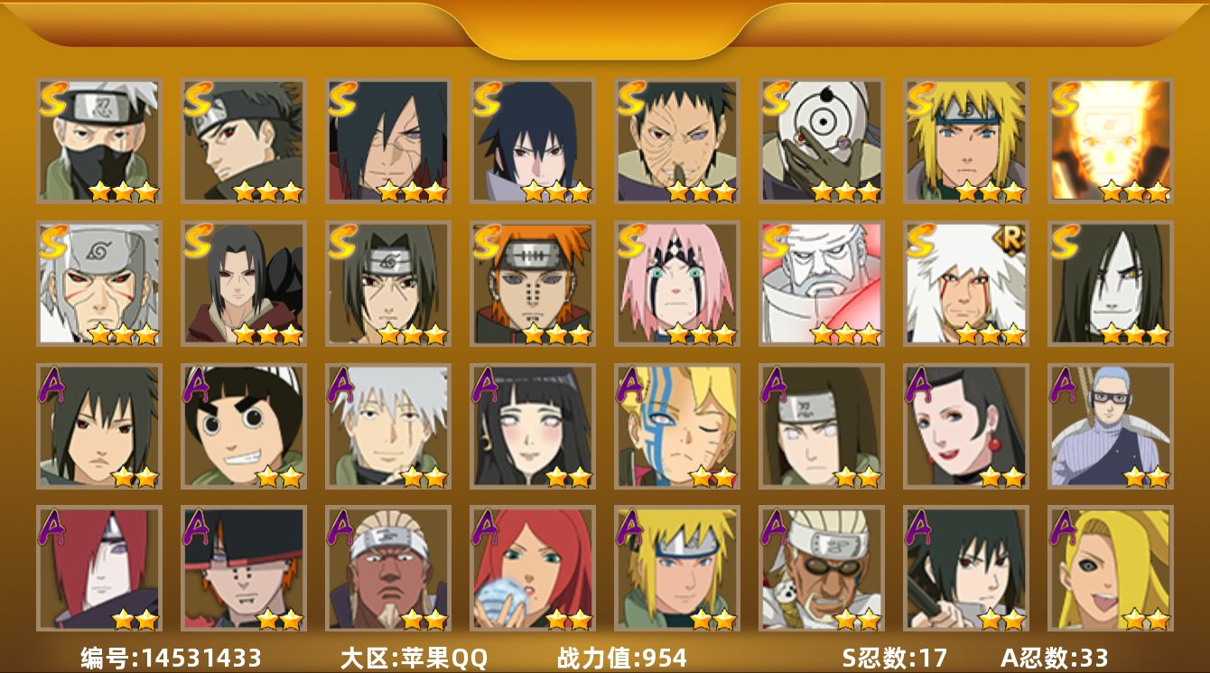 [14531433]v10 17s 33a 954万战力 2.4w金币 1035点券 忍战大野木75片 面具男65片 木叶创立斑85片 创立柱间90片 日斩59片 zp3298 【s级忍者】:千手扉间「秽土转生」3星,宇智波鼬「秽土转生」3星,宇智波斑「秽土转生·解」3星,春野樱「忍界大战」3星,宇智波带土「忍界大战」3星,宇智波鼬「须佐能乎」3星,宇智波止水「须佐能乎」3星,旗木卡卡西「须佐能乎」3星,自来也「舞之豪杰」3星,大蛇丸3星,波风水门3星,漩涡鸣人「九喇嘛连结」3星,佩恩「天道」3星,宇智波佐助「永恒万花筒」3星,宇智波斑 「白面具」3星宇智波斑「白面具」,大筒木金式3星,波风水门「九喇嘛连结」3星 【a级忍者】:艾「青年」2星,长门「青年」2星,波风水门「青年」2星,达鲁伊「博人传」2星,迪达拉2星,迪达拉「秽土转生」2星,大蛇丸「晓」2星,奇拉比「忍界大战」2星,飞段2星,飞段「死司凭血」2星,干柿鬼鲛5星,漩涡博人「桃式显现」2星,漩涡鸣人「九尾查克拉」2星,迈特凯5星,旗木卡卡西「幻之真容」2星,桃地再不斩「秽土转生」2星,我爱罗「疾风传」4星,蝎3星,猿飞阿斯玛5星,宇智波鼬2星,宇智波佐助「须佐能乎」2星,宇智波佐助「万花筒写轮眼」2星,照美冥「五代目水影」2星,日向宁次「忍界大战」2星,日向雏田「最终章」2星,长十郎「六代目水影」2星,佩恩·六道「漂泊浪客」2星,李洛克「忍界大战」2星,秋道丁次「忍界大战」2星,千代「近松十人卫」2星,不缘2星,不风2星,宇智波泉奈2星