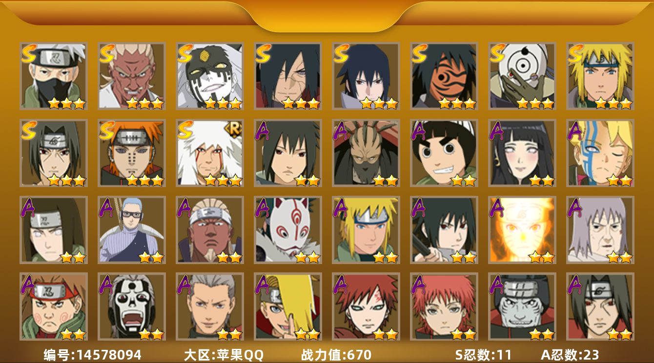 [14578094]v8 670万战力 11s-23a 创立柱间80片 ll5483 【s级忍者】:宇智波斑「秽土转生·解」3星,艾「忍界大战」3星,宇智波鼬「须佐能乎」3星,旗木卡卡西「须佐能乎」3星,自来也「舞之豪杰」3星,波风水门3星,神秘面具男「红夜之刃」3星,佩恩「天道」3星,宇智波佐助「永恒万花筒」3星,宇智波斑 「白面具」3星宇智波斑「白面具」,大筒木桃式3星 【a级忍者】:艾「青年」2星,波风水门「青年」2星,迪达拉2星,飞段2星,飞段「死司凭血」2星,干柿鬼鲛2星,漩涡博人「桃式显现」2星,漩涡鸣人「九尾查克拉」2星,迈特凯3星,我爱罗「疾风传」3星,蝎2星,蝎「绯流琥」2星,猿飞阿斯玛3星,宇智波鼬2星,宇智波佐助「须佐能乎」2星,日向宁次「忍界大战」2星,日向雏田「最终章」2星,长十郎「六代目水影」2星,神秘面具男「忍者之路」2星,李洛克「忍界大战」2星,秋道丁次「忍界大战」2星,千代「近松十人卫」2星,宇智波泉奈2星