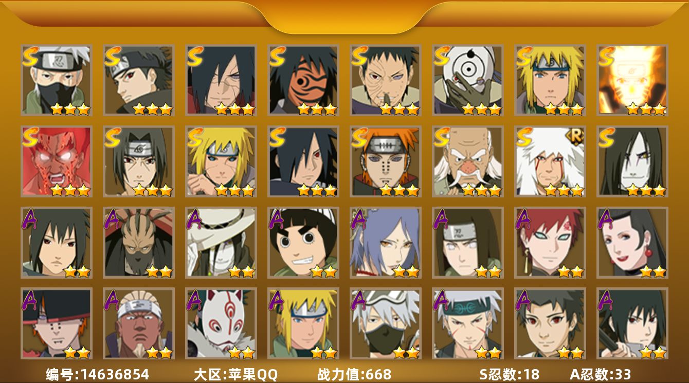 [14636854]v13 18s 33a 668w战力 博人传桃式97片 2个主场景:博人传 木叶周年庆 30张招募券 yy1574 【s级忍者】:波风水门「秽土转生」3星,宇智波斑「秽土转生·解」3星,大野木「忍界大战」3星,宇智波带土「忍界大战」3星,宇智波鼬「须佐能乎」3星,宇智波止水「须佐能乎」3星,旗木卡卡西「须佐能乎」3星,宇智波斑「木叶创立」3星,自来也「舞之豪杰」3星,大蛇丸3星,自来也「传说中的三忍」3星,波风水门3星,神秘面具男「红夜之刃」3星,漩涡鸣人「九喇嘛连结」3星,迈特凯「死门」3星,佩恩「天道」3星,宇智波斑 「白面具」3星宇智波斑「白面具」,波风水门「九喇嘛连结」3星 【a级忍者】:艾「青年」2星,波风水门「青年」2星,达鲁伊「博人传」2星,大蛇丸「新春限定」2星,飞段3星,飞段「死司凭血」2星,干柿鬼鲛4星,漩涡鸣人「九尾查克拉」2星,迈特凯4星,旗木卡卡西「元气夏日」2星,桃地再不斩「漂泊武士」2星,我爱罗「疾风传」3星,我爱罗「新春限定」2星,蝎2星,蝎「绯流琥」2星,小南「漂泊浪客」2星,猿飞阿斯玛4星,宇智波止水「新春限定」2星,宇智波鼬2星,宇智波鼬「新春限定」2星,宇智波佐助「须佐能乎」2星,宇智波佐助「万花筒写轮眼」2星,照美冥「五代目水影」2星,日向宁次「忍界大战」2星,宇智波带土「暴怒」2星,卑留呼「火之意志继承者」2星,神秘面具男「忍者之路」2星,佩恩·六道「漂泊浪客」2星,李洛克「忍界大战」2星,黑土「博人传」2星,千手扉间「漂泊武士」2星,不缘2星,宇智波泉奈2星