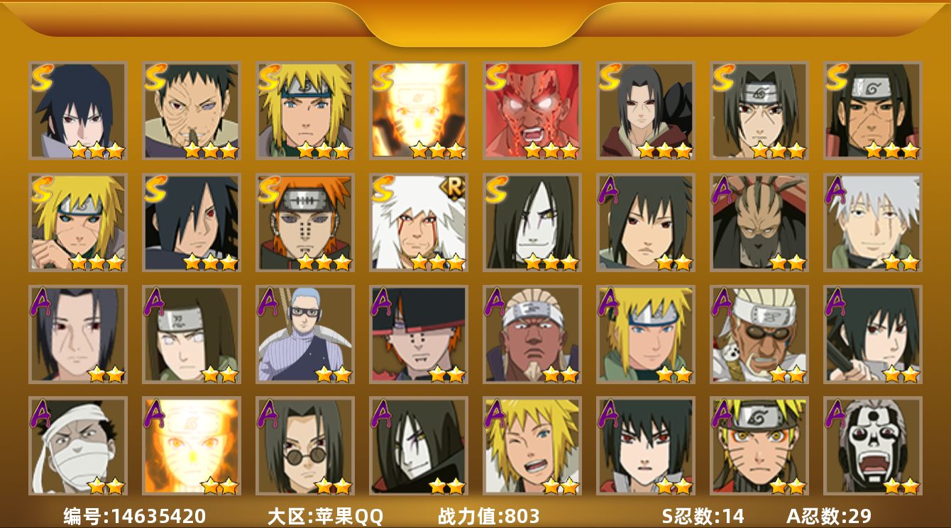 [14635420]v11 803万战力 14s-29a 纲手55片 忍战大野木70片 ll5505 【s级忍者】:波风水门「秽土转生」3星,千手柱间「秽土转生」3星,宇智波鼬「秽土转生」3星,宇智波带土「忍界大战」3星,宇智波鼬「须佐能乎」3星,宇智波斑「木叶创立」3星,自来也「舞之豪杰」3星,大蛇丸3星,自来也「传说中的三忍」3星,波风水门3星,漩涡鸣人「九喇嘛连结」3星,迈特凯「死门」3星,佩恩「天道」3星,宇智波佐助「永恒万花筒」3星 【a级忍者】:艾「青年」2星,波风水门「青年」2星,波风水门「新春限定」2星,达鲁伊「博人传」2星,大蛇丸「晓」2星,奇拉比「忍界大战」2星,飞段3星,飞段「死司凭血」2星,干柿鬼鲛5星,漩涡鸣人「仙人模式」2星,漩涡鸣人「九尾查克拉」2星,迈特凯5星,旗木卡卡西「幻之真容」2星,桃地再不斩「漂泊武士」2星,桃地再不斩「秽土转生」2星,我爱罗「疾风传」3星,蝎2星,蝎「绯流琥」2星,猿飞阿斯玛4星,宇智波鼬2星,宇智波鼬「新春限定」2星,宇智波鼬「夏日限定」2星,宇智波佐助「须佐能乎」2星,宇智波佐助「万花筒写轮眼」2星,日向宁次「忍界大战」2星,长十郎「六代目水影」2星,佩恩·六道「漂泊浪客」2星,宇智波泉奈2星,迈特凯「青春爆炸」2星
