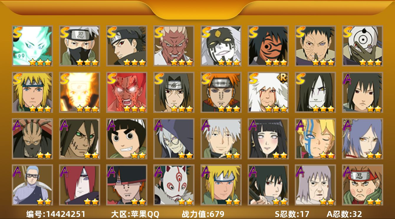 [14424251]v11,17s,32a,679万战力,限时点卷2000,已购大福袋,热门a面麻、真容卡卡西、侠隐兜、漂泊六道、漂泊小南等。秽土鼬83片,五影斑80片,金水门78片,创立斑84片,秽土长门47片王者连体162皮肤.10传说)yy1544 【s级忍者】:宇智波带土「忍界大战」3星,艾「忍界大战」3星,宇智波鼬「须佐能乎」3星,宇智波止水「须佐能乎」3星,旗木卡卡西「须佐能乎」3星,自来也「舞之豪杰」3星,大蛇丸3星,自来也「传说中的三忍」3星,波风水门3星,神秘面具男「红夜之刃」3星,漩涡鸣人「九喇嘛连结」3星,迈特凯「死门」3星,佩恩「天道」3星,宇智波斑 「白面具」3星宇智波斑「白面具」,大筒木桃式3星,大筒木舍人「最终章」3星,漩涡鸣人「暴怒·第六尾」3星 【a级忍者】:长门「青年」2星,波风水门「青年」2星,达鲁伊「博人传」2星,迪达拉2星,奇拉比2星,飞段3星,飞段「死司凭血」2星,干柿鬼鲛4星,漩涡博人「桃式显现」2星,机械鸣人「初始形态」2星,迈特凯4星,旗木卡卡西「幻之真容」2星,我爱罗「疾风传」3星,蝎2星,蝎「绯流琥」2星,小南「漂泊浪客」2星,角都「秽土转生」2星,猿飞阿斯玛4星,宇智波鼬2星,宇智波佐助「须佐能乎」2星,宇智波佐助「万花筒写轮眼」2星,药师兜「侠影江湖」2星,照美冥「五代目水影」2星,日向雏田「最终章」2星,长十郎「六代目水影」2星,神秘面具男「忍者之路」2星,佩恩·六道「漂泊浪客」2星,李洛克「忍界大战」2星,秋道丁次「忍界大战」2星,千代「近松十人卫」2星,神农「羁绊」2星,宇智波泉奈2星 【永久主场景】:博人传,木叶周年庆