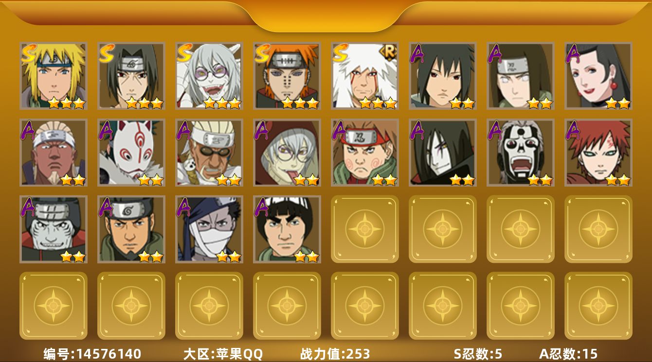 [14576140]v4 253万战力 5s-15a ll5474 【s级忍者】:宇智波鼬「须佐能乎」3星,自来也「舞之豪杰」3星,波风水门3星,药师兜「仙人模式」3星,佩恩「天道」3星 【a级忍者】:艾「青年」2星,大蛇丸「晓」2星,奇拉比「忍界大战」2星,飞段「死司凭血」2星,干柿鬼鲛2星,迈特凯2星,桃地再不斩2星,我爱罗「疾风传」2星,猿飞阿斯玛2星,药师兜「半蛇斗篷」2星,日向宁次「忍界大战」2星,神秘面具男「忍者之路」2星,秋道丁次「忍界大战」2星,不缘2星,宇智波泉奈2星