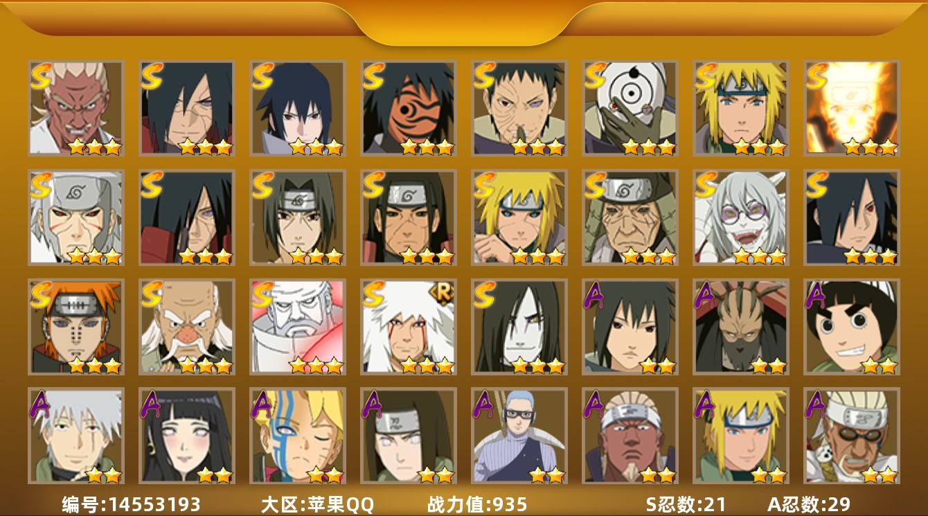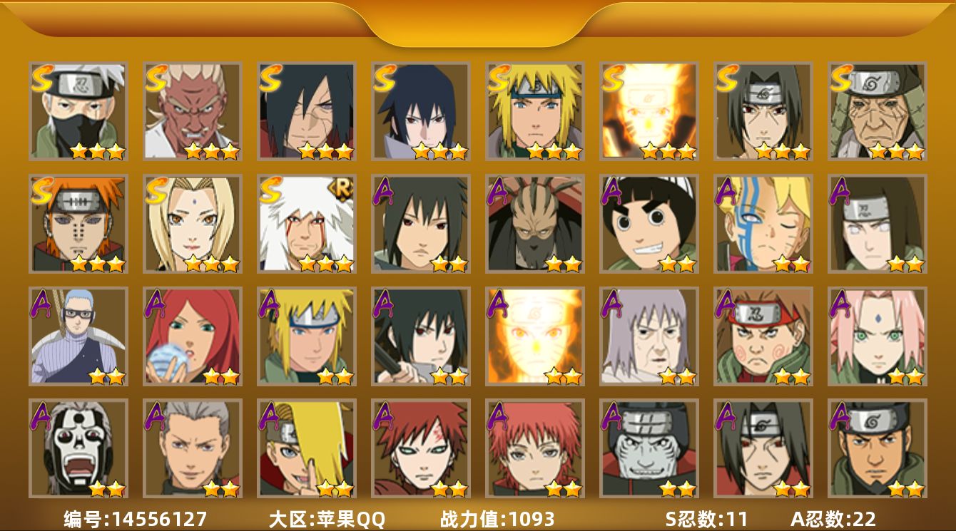 [14556127]v4 11s 22a 1093万战力 点券745 限时点券200 自来也80片 传说自来也70片 日斩84片 zp3273 【s级忍者】:猿飞日斩「秽土转生」3星,宇智波斑「秽土转生·解」3星,艾「忍界大战」3星,宇智波鼬「须佐能乎」3星,旗木卡卡西「须佐能乎」3星,自来也「舞之豪杰」3星,纲手3星,波风水门4星,漩涡鸣人「九喇嘛连结」3星,佩恩「天道」3星,宇智波佐助「永恒万花筒」3星 【a级忍者】:波风水门「青年」2星,迪达拉2星,飞段2星,飞段「死司凭血」2星,干柿鬼鲛5星,漩涡博人「桃式显现」3星,漩涡鸣人「九尾查克拉」2星,迈特凯5星,我爱罗「疾风传」3星,蝎3星,蝎「绯流琥」2星,猿飞阿斯玛5星,宇智波鼬2星,宇智波佐助「须佐能乎」2星,日向宁次「忍界大战」3星,长十郎「六代目水影」2星,李洛克「忍界大战」2星,春野樱「百豪」2星,秋道丁次「忍界大战」2星,千代「近松十人卫」2星,不风2星,宇智波泉奈2星
