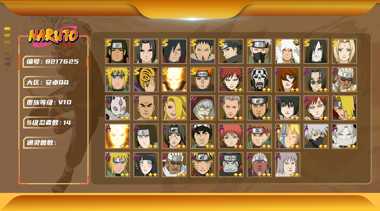 [8217602]xr37107-游戏区服-安卓qq-找回包赔-12s级忍者数-23a级忍者数 【s级忍者】:猿飞日斩「秽土转生」3星猿飞日斩「秽土转生」,宇智波斑「秽土转生·解」3星宇智波斑「秽土转生·解」,艾「忍界大战」3星艾「忍界大战」,宇智波止水「须佐能乎」3星宇智波止水「须佐能乎」,旗木卡卡西「须佐能乎」3星旗木卡卡西「须佐能乎」,自来也「舞之豪杰」3星自来也「舞之豪杰」,纲手3星纲手,波风水门3星波风水门,漩涡鸣人「九喇嘛连结」3星漩涡鸣人「九喇嘛连结」,佩恩「天道」3星佩恩「天道」,宇智波佐助「永恒万花筒」3星宇智波佐助「永恒万花筒」,宇智波斑「白面具」3星宇智波斑「白面具」 【a级忍者】:长门「青年」2星长门「青年」,波风水门「青年」2星波风水门「青年」,迪达拉「秽土转生」2星迪达拉「秽土转生」,飞段「死司凭血」2星飞段「死司凭血」,干柿鬼鲛2星干柿鬼鲛,漩涡博人「桃式显现」2星漩涡博人「桃式显现」,漩涡鸣人「九尾查克拉」2星漩涡鸣人「九尾查克拉」,迈特凯2星迈特凯,旗木卡卡西「幻之真容」2星旗木卡卡西「幻之真容」,我爱罗「疾风传」2星我爱罗「疾风传」,蝎2星蝎,蝎「绯流琥」2星蝎「绯流琥」,角都「秽土转生」2星角都「秽土转生」,猿飞阿斯玛2星猿飞阿斯玛,宇智波鼬2星宇智波鼬,宇智波佐助「须佐能乎」2星宇智波佐助「须佐能乎」,日向宁次「忍界大战」2星日向宁次「忍界大战」,长十郎「六代目水影」2星长十郎「六代目水影」,佩恩·六道「漂泊浪客」2星佩恩·六道「漂泊浪客」,李洛克「忍界大战」2星李洛克「忍界大战」,秋道丁次「忍界大战」2星秋道丁次「忍界大战」,千代「近松十人卫」2星千代「近松十人卫」,宇智波泉奈2星宇智波泉奈