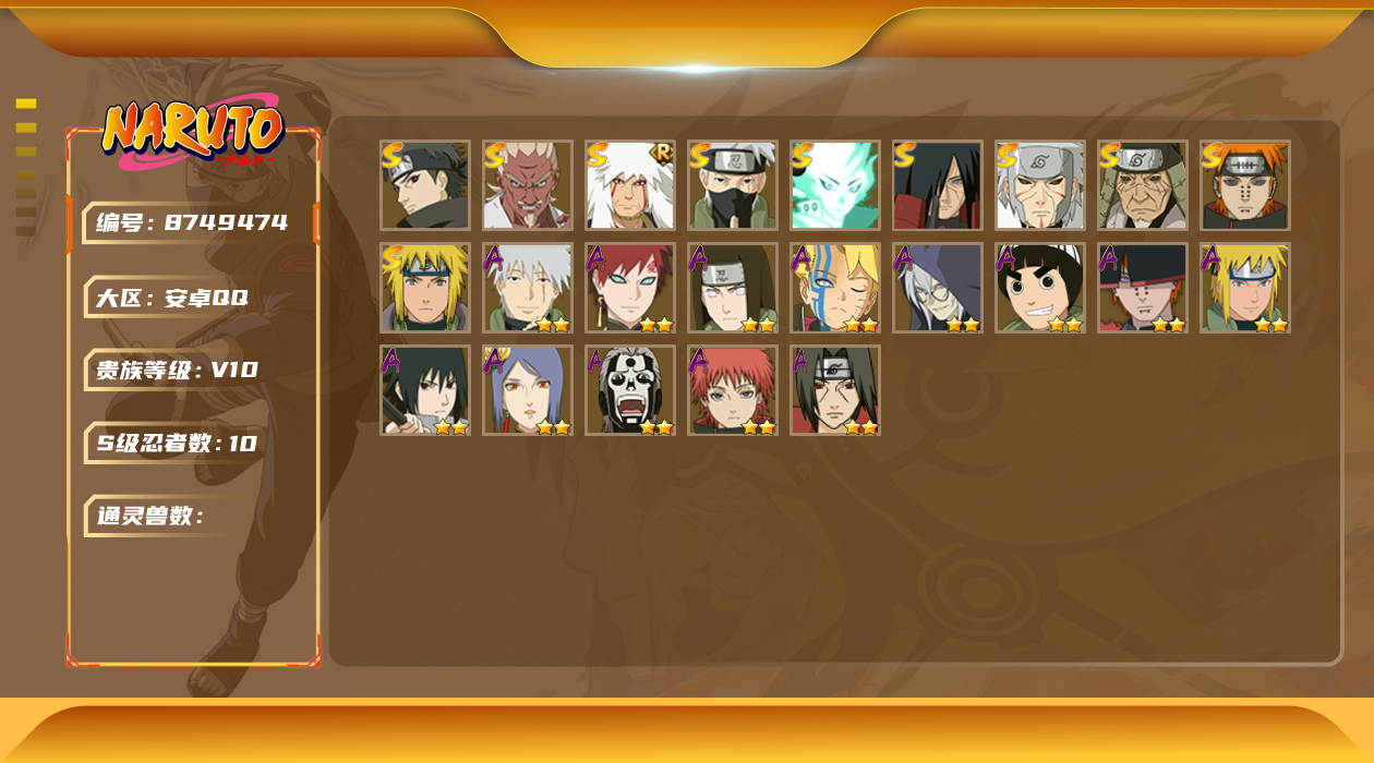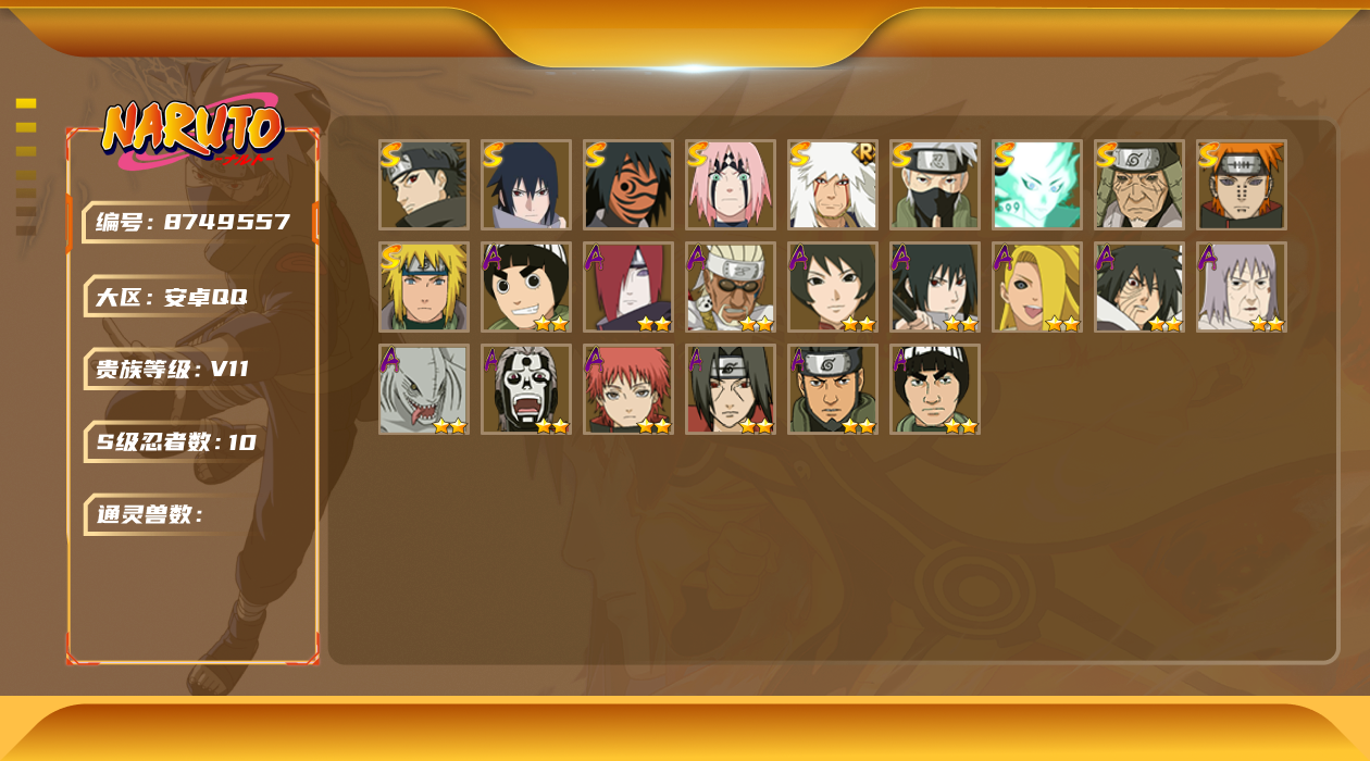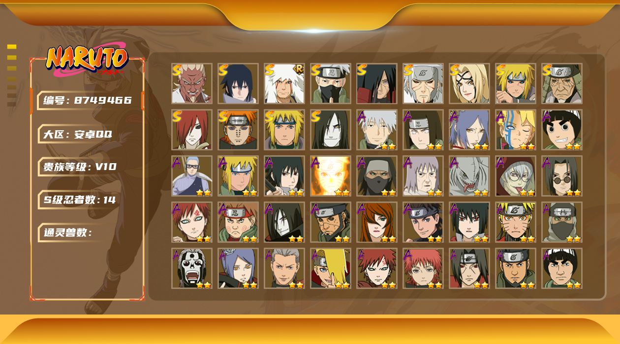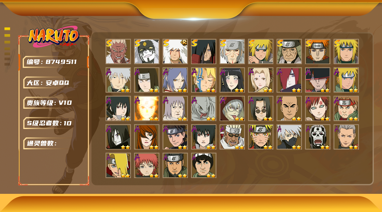 [8749396]x9431战斗力:989w;段位:影级2阶;本服排名:314;战区排名:未上榜;vip10级;s忍24个;a忍39个;通灵兽20个;s忍:宇智波斑(普通)秽土转生波风水门秽土转生宇智波斑忍界大战宇智波带土仙人模式药师兜秽土转生千手柱间4星波风水门(普通)秽土转生长门九喇嘛连结漩涡鸣人秽土转生宇智波鼬千手柱间(普通)秽土转生解宇智波斑四代目雷影艾忍界大战艾千手扉间(普通)白面具宇智波斑自来也(普通)忍界大战春野樱秽土转生千手扉间舞之豪杰自来也死门迈特凯秽土转生猿飞日斩4星大蛇丸(普通)超佩恩天道;a忍:5星迈特凯(普通)5星猿飞阿斯玛(普通)5星蝎(普通)5星干柿鬼鲛(普通)4星疾风传我爱罗4星飞段(普通)3星迪达拉(普通)3星秽土转生迪达拉3星死司凭血飞段3星四代目土影黑土仙人模式漩涡鸣人九尾查克拉漩涡鸣人万花筒写轮眼宇智波佐助须佐能乎宇智波佐助宇智波泉奈百豪春野樱忍界大战秋道丁次忍界大战日向宁次忍界大战李洛克万花筒写轮眼旗木卡卡西宇智波止水(普通)青年波风水门忍界大战我爱罗近松十人卫千代五代目水影照美冥忍界大战奇拉比奇拉比(普通)半蛇斗篷药师兜青年长门漂泊浪客佩恩六道小南(普通)夏日泳装小南角都(普通)地怨虞角都晓大蛇丸宇智波鼬(普通)木叶上忍猿飞木叶丸五代目雷影达鲁伊桃式显现漩涡博人;通灵兽:忍犬(普通)蓝蛇蛤蟆吉忍龟镰鼬猿魔山椒鱼蜃鲛鲨蛤蟆仙人蛤蟆健乌鸦(普通)熊猫蛤蟆龙蛤蟆广砂之守鹤蛞蝓(普通)梦貘鹰蜘蛛;时装:百战波风水门百战大蛇丸狂野鲛鲨干柿鬼鲛蜀面豪杰舞之豪杰自来也;详情看图【740区】【安卓qq】【可二次实名】