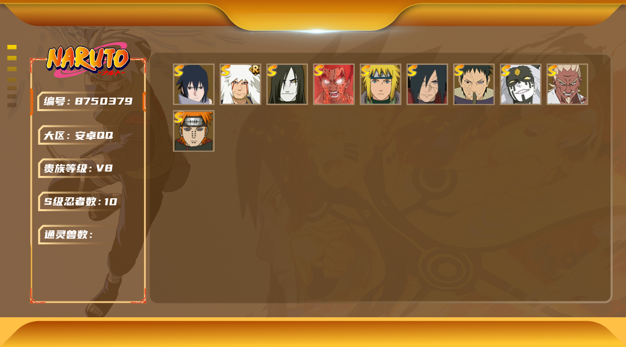 [8750379]v8 10s忍 548.8w战力 可二次 s级忍者:艾「忍界大战」大筒木桃式宇智波斑「秽土转生·解」宇智波佐助「永恒万花筒」迈特凯「死门」宇智波带土 「忍界大战」自来也 「舞之豪杰」佩恩「天道」波风水门大蛇丸