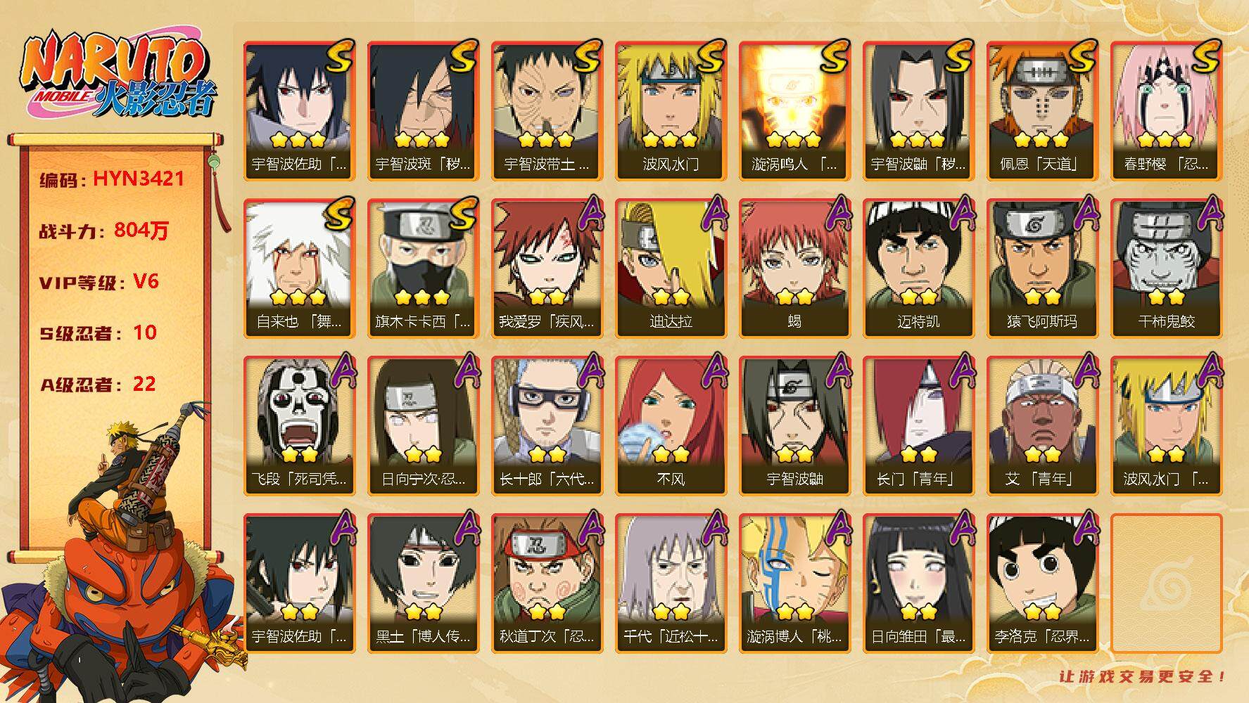 【hyn3422】v10/s忍6/a忍19/通灵兽12/2星我爱罗「疾风传」/蜃/2星达鲁伊「博人传」/2星飞段「死司凭血」/3星宇智波鼬「秽土转生」/蛤蟆健/3星宇智波带土「忍界大战」/2星蝎/3星波风水门/2星秋道丁次「忍界大战」/2星宇智波鼬「新春限定」/2星漩涡博人「桃式显现」/2星奇拉比「忍界大战」/3星千手柱间「秽土转生」/蓝蛇/砂之守鹤/2星神秘面具男「忍者之路」/2星长十郎「六代目水影」/2星波风水门「青年」/3星自来也「舞之豪杰」/2星黑土「博人传」/蛤蟆吉/2星飞段/2星猿飞阿斯玛/镰鼬/2星宇智波佐助「万花筒写轮眼」/忍犬/山椒鱼/2星干柿鬼鲛/3星大蛇丸/2星不缘/2星宇智波佐助「须佐能乎」/猿魔/蛤蟆仙人/2星千代「近松十人卫」/忍龟/鲛鲨