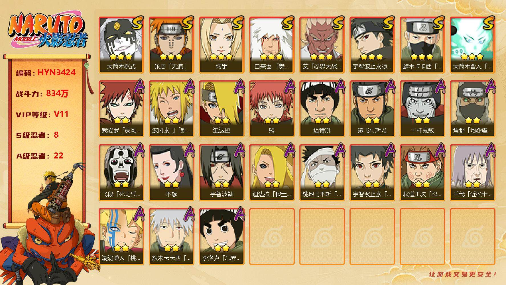 【hyn3430】v8/战力424w/s忍5/a忍17/通灵兽13/3星自来也「舞之豪杰」/2星我爱罗「疾风传」/2星宇智波鼬/2星迈特凯/3星宇智波止水「须佐能乎」/2星我爱罗「新春限定」/2星蝎/2星药师兜「半蛇斗篷」/3星佩恩「天道」/2星猿飞阿斯玛/2星宇智波泉奈/3星波风水门「秽土转生」/2星秋道丁次「忍界大战」/2星迪达拉/2星猿飞阿斯玛「秽土转生」/2星角都「秽土转生」/2星干柿鬼鲛/2星漩涡博人「桃式显现」/3星艾「忍界大战」/2星宇智波佐助「须佐能乎」/2星李洛克「忍界大战」/2星蝎「绯流琥」