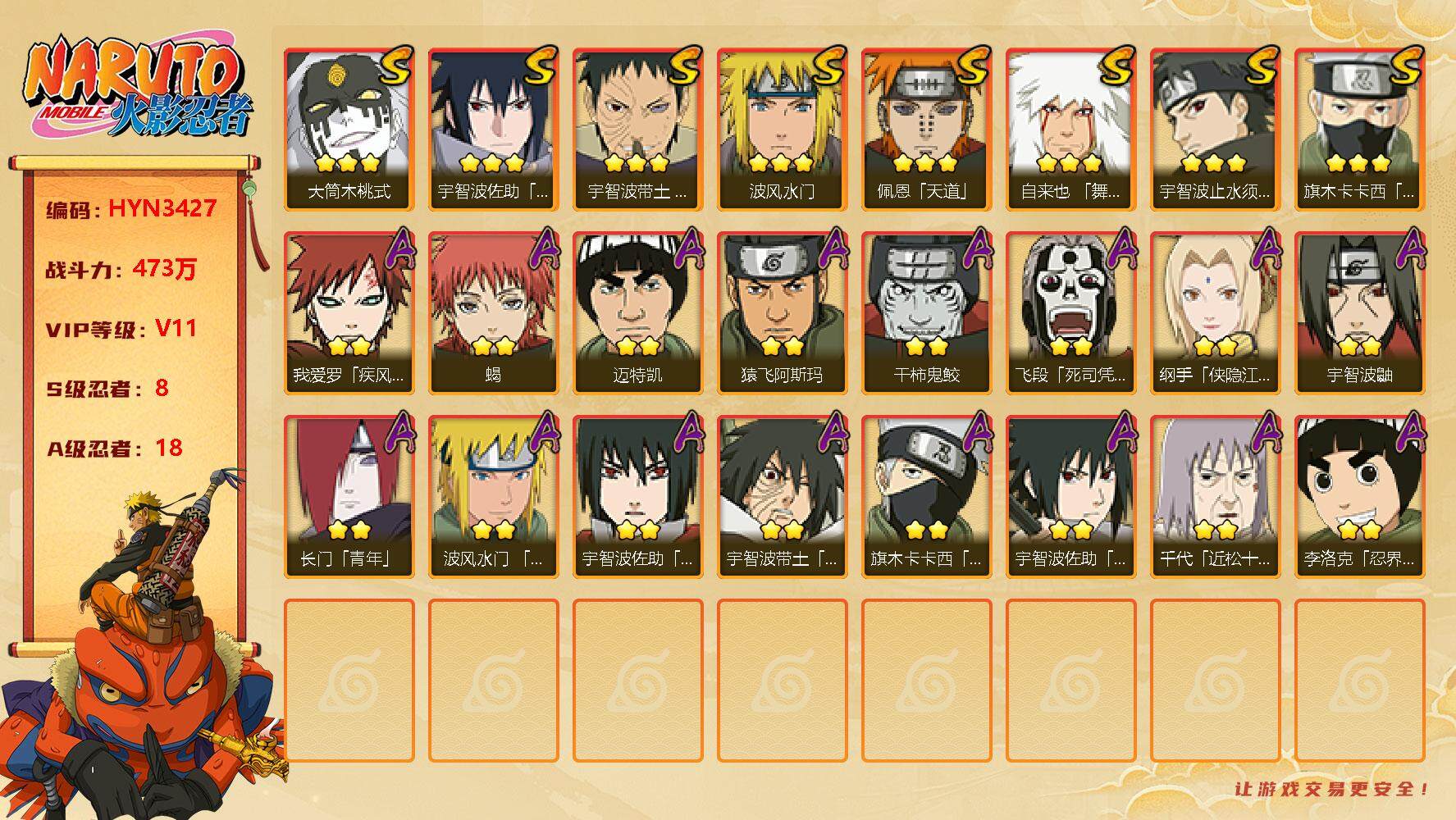 【hyn3427】v11/战力473w/s忍8/a忍18/通灵兽15/2星旗木卡卡西「忍界大战」/2星纲手「侠隐江湖」/2星我爱罗「疾风传」/2星飞段「死司凭血」/2星宇智波鼬/3星宇智波佐助「永恒万花筒」/3星旗木卡卡西「须佐能乎」/2星长门「青年」/2星迈特凯/3星宇智波带土「忍界大战」/2星蝎/3星佩恩「天道」/3星波风水门/2星角都「秽土转生」/2星李洛克「忍界大战」/3星大筒木桃式/2星波风水门「青年」/3星自来也「舞之豪杰」/2星宇智波带土「暴怒」/3星宇智波止水「须佐能乎」/2星猿飞阿斯玛/2星宇智波佐助「万花筒写轮眼」/2星宇智波泉奈/2星干柿鬼鲛/2星宇智波佐助「须佐能乎」/2星千代「近松十人卫」