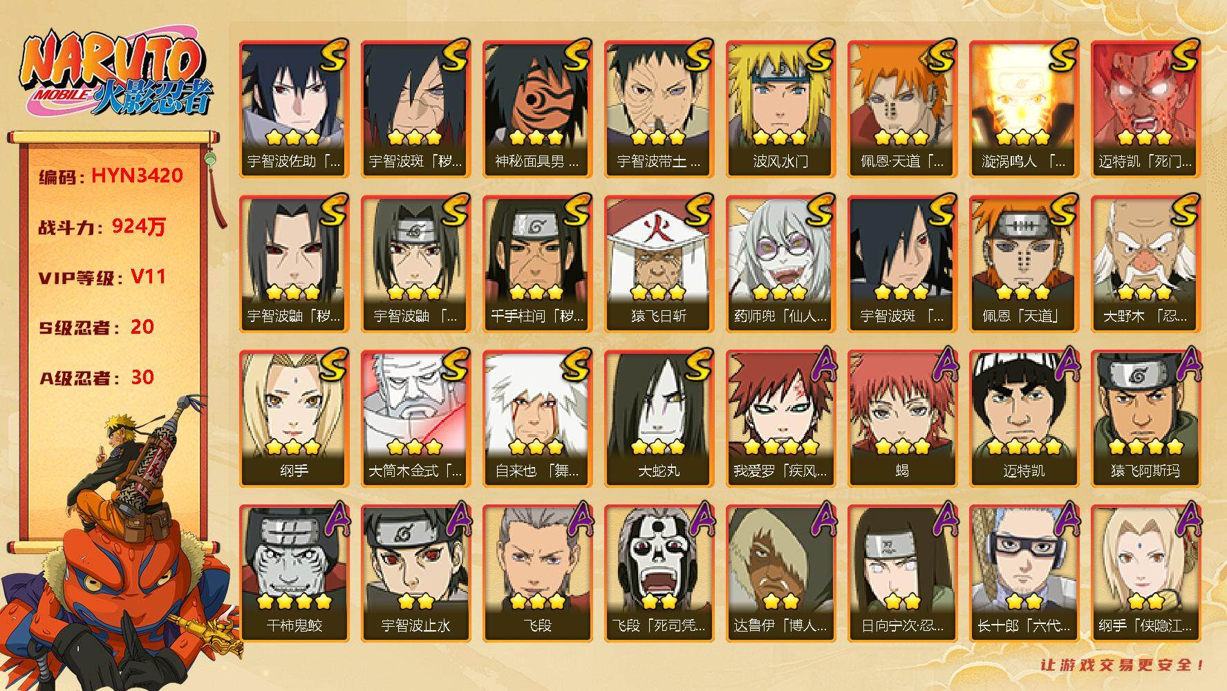 【hyn3420】v11/战力924w/s忍20/a忍30/通灵兽17/4星干柿鬼鲛/2星纲手「侠隐江湖」/3星纲手/蜃/2星达鲁伊「博人传」/2星飞段「死司凭血」/2星宇智波止水/2星照美冥「五代目水影」/3星蝎/2星宇智波鼬「新春限定」/2星奇拉比「忍界大战」/蓝蛇/砂之守鹤/3星药师兜「仙人模式」/2星长十郎「六代目水影」/2星春野樱「百豪」/3星迈特凯「死门」/蛞蝓/3星猿飞日斩/2星宇智波带土「暴怒」/2星黑土「博人传」/3星佩恩·天道「超」/2星迪达拉「秽土转生」/镰鼬/4星我爱罗「疾风传」/山椒鱼/蛤蟆仙人/梦貘/2星日向宁次「忍界大战」/2星宇智波鼬/3星宇智波佐助「永恒万花筒」/3星大筒木金式/3星宇智波鼬「秽土转生」/2星长门「青年」/蛤蟆健/3星宇智波带土「忍界大战」/3星飞段/3星佩恩「天道」/3星波风水门/3星漩涡鸣人「九喇嘛连结」/乌鸦/2星秋道丁次「忍界大战」/2星漩涡博人「桃式显现」/蛤蟆广/3星千手柱间「秽土转生」/2星波风水门「青年」/4星猿飞阿斯玛/3星自来也「舞之豪杰」/4星迈特凯/3星神秘面具男「红夜之刃」/蛤蟆吉/2星不风/2星宇智波泉奈/2星宇智波止水「新春限定」/忍犬/3星宇智波斑「木叶创立」/3星大蛇丸/3星宇智波斑「秽土转生·解」/2星艾「青年」/3星大野木「忍界大战」/2星宇智波佐助「须佐能乎」/猿魔/蛤蟆龙/2星千代「近松十人卫」/忍龟/鲛鲨/3星宇智波鼬「须佐能乎」