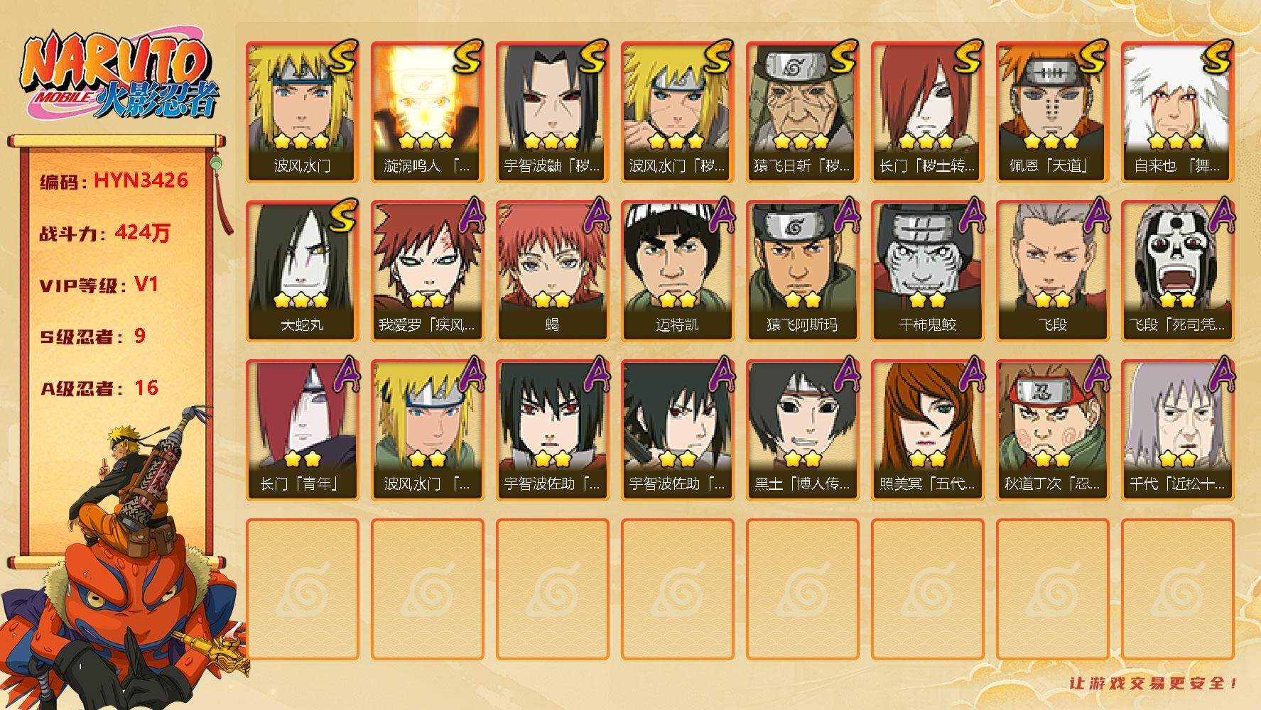 【hyn3426】v1/战力424w/s忍9/a忍16/2星我爱罗「疾风传」/2星飞段「死司凭血」/3星宇智波鼬「秽土转生」/2星长门「青年」/2星迈特凯/2星蝎/3星猿飞日斩「秽土转生」/3星佩恩「天道」/2星照美冥「五代目水影」/3星波风水门/3星漩涡鸣人「九喇嘛连结」/3星波风水门「秽土转生」/2星秋道丁次「忍界大战」/2星波风水门「青年」/3星自来也「舞之豪杰」/2星黑土「博人传」/2星飞段/2星猿飞阿斯玛/2星宇智波佐助「万花筒写轮眼」/2星宇智波泉奈/2星干柿鬼鲛/3星大蛇丸/2星宇智波佐助「须佐能乎」/2星千代「近松十人卫」/3星长门「秽土转生」
