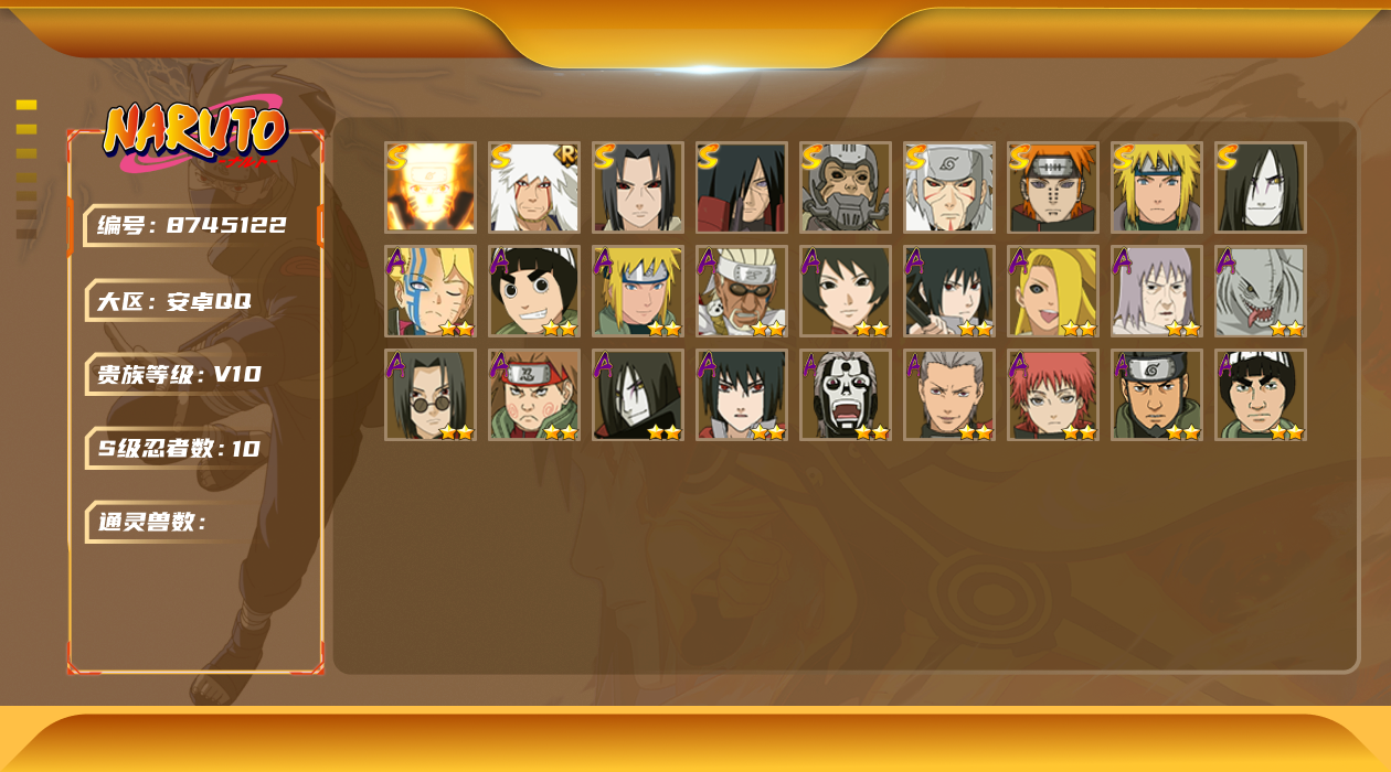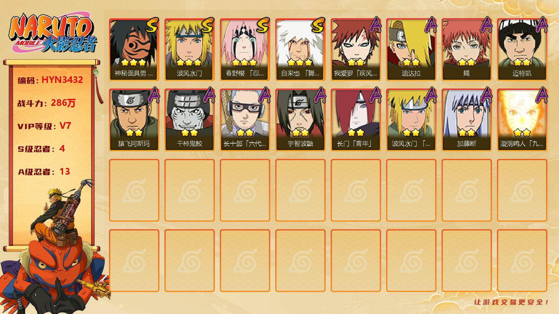 【hyn3432】v7/战力286w/s忍4/a忍13/通灵兽12/2星我爱罗「疾风传」/蜃/2星宇智波鼬/2星长门「青年」/2星迈特凯/蛤蟆健/2星蝎/3星波风水门/蓝蛇/砂之守鹤/2星长十郎「六代目水影」/2星波风水门「青年」/3星自来也「舞之豪杰」/3星神秘面具男「红夜之刃」/蛤蟆吉/2星猿飞阿斯玛/镰鼬/3星春野樱「忍界大战」/2星加藤断/2星宇智波泉奈/2星迪达拉/忍犬/山椒鱼/2星干柿鬼鲛/2星漩涡鸣人「九尾查克拉」/猿魔/蛤蟆仙人/忍龟/鲛鲨