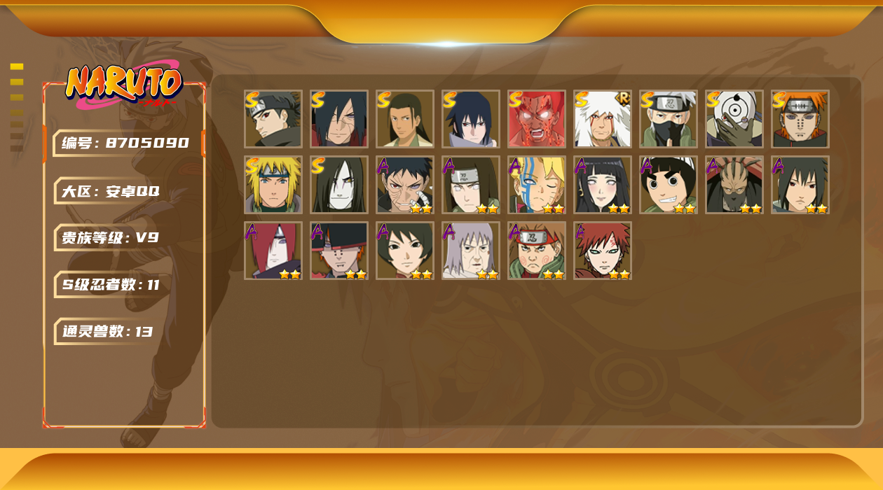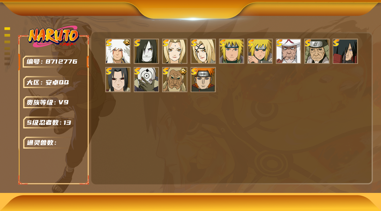 [8712776]v9 13s 可二次 s级忍者:自来也 「舞之豪杰」宇智波鼬「秽土转生」宇智波斑「秽土转生」艾「三代目雷影」“宇智波斑” 「白面具」纲手「百豪」波风水门「秽土转生」猿飞日斩「秽土转生」佩恩「天道」猿飞日斩波风水门大蛇丸纲手
