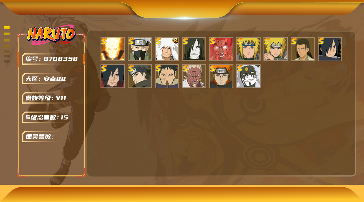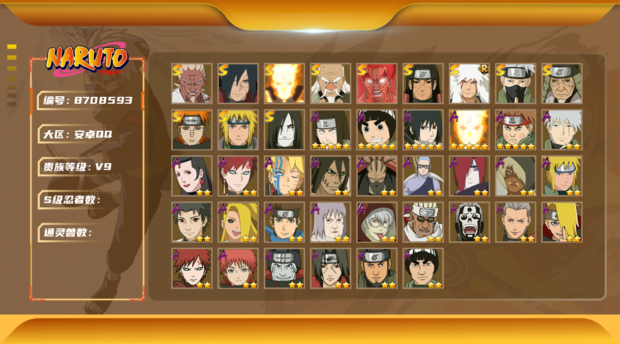 【安卓q-2893区-v1-400万战-6s-19a-106忍者-13通灵】 s;永恒佐助 秽土鼬 波风水门 大蛇丸 豪杰自来也 佩恩 a;万花筒佐助 须佐佐助 忍战宁次 青年长门