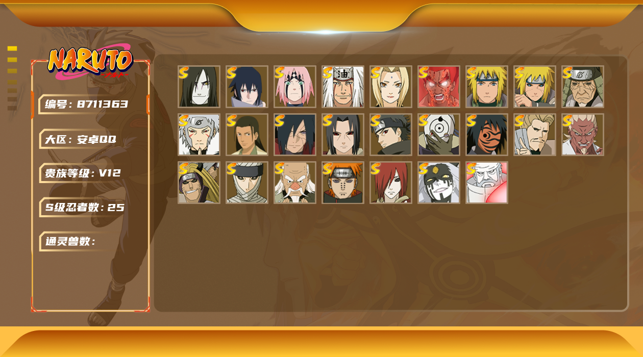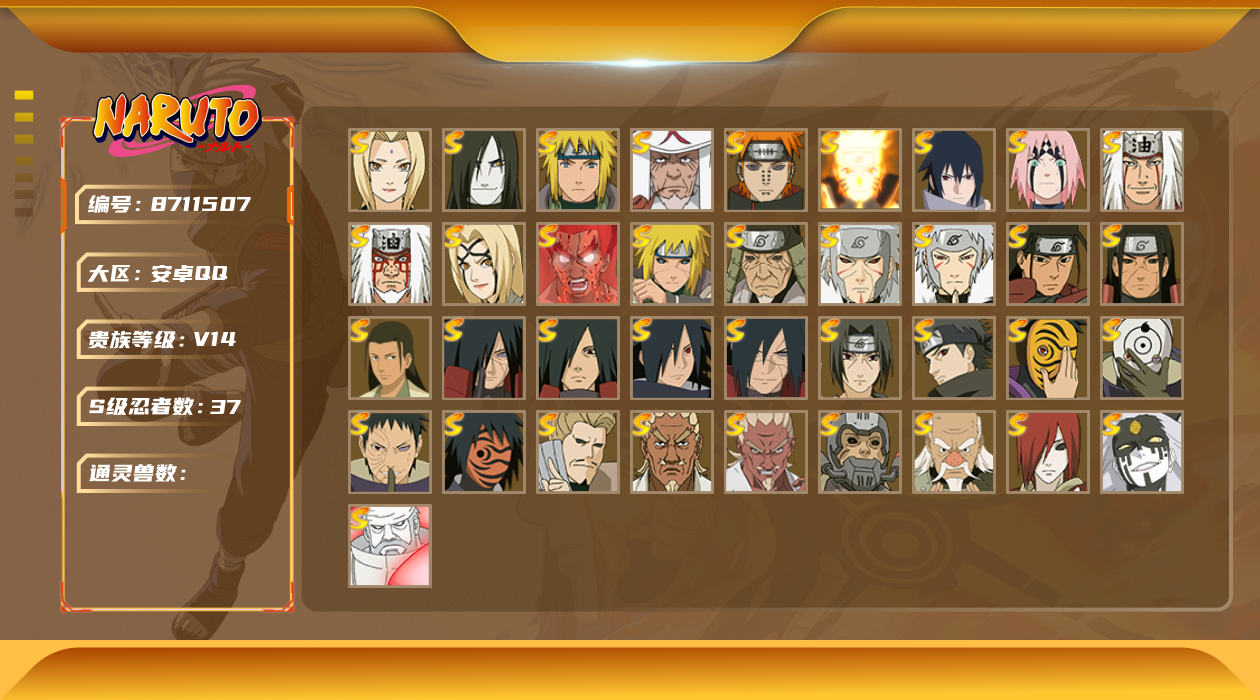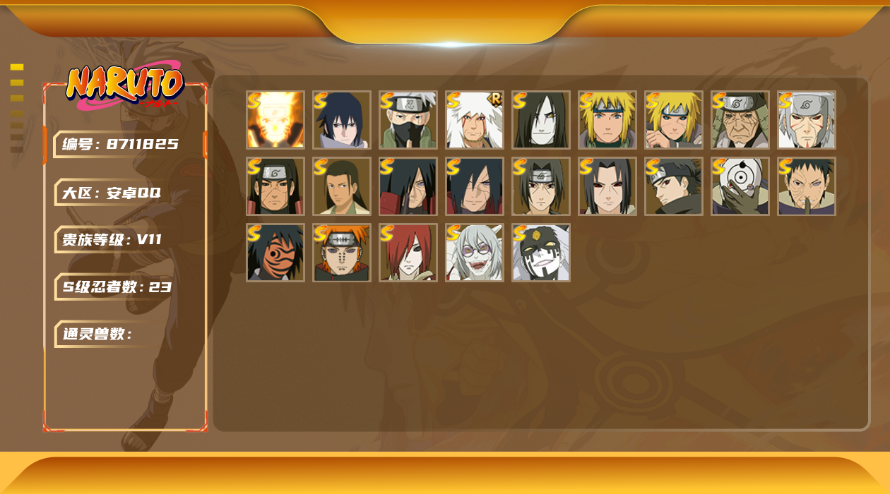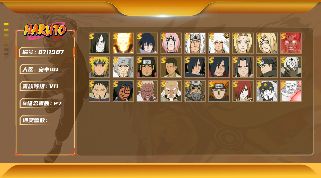 [8711987]v11 27s 可二次 s级忍者:宇智波止水「须佐能乎」艾「忍界大战」大筒木桃式宇智波斑「秽土转生·解」千手柱间·木叶创立宇智波佐助「永恒万花筒」神秘面具男 「红夜之刃」春野樱 「忍界大战」大筒木金式「博人传」漩涡鸣人 「九喇嘛连结」大野木 「忍界大战」迈特凯「死门」宇智波斑 「木叶创立」宇智波带土 「忍界大战」千手柱间「秽土转生」自来也 「舞之豪杰」宇智波鼬「秽土转生」“宇智波斑” 「白面具」半藏「秽土转生」千手扉间「秽土转生」纲手「百豪」长门「秽土转生」佩恩「天道」波风水门大蛇丸自来也纲手