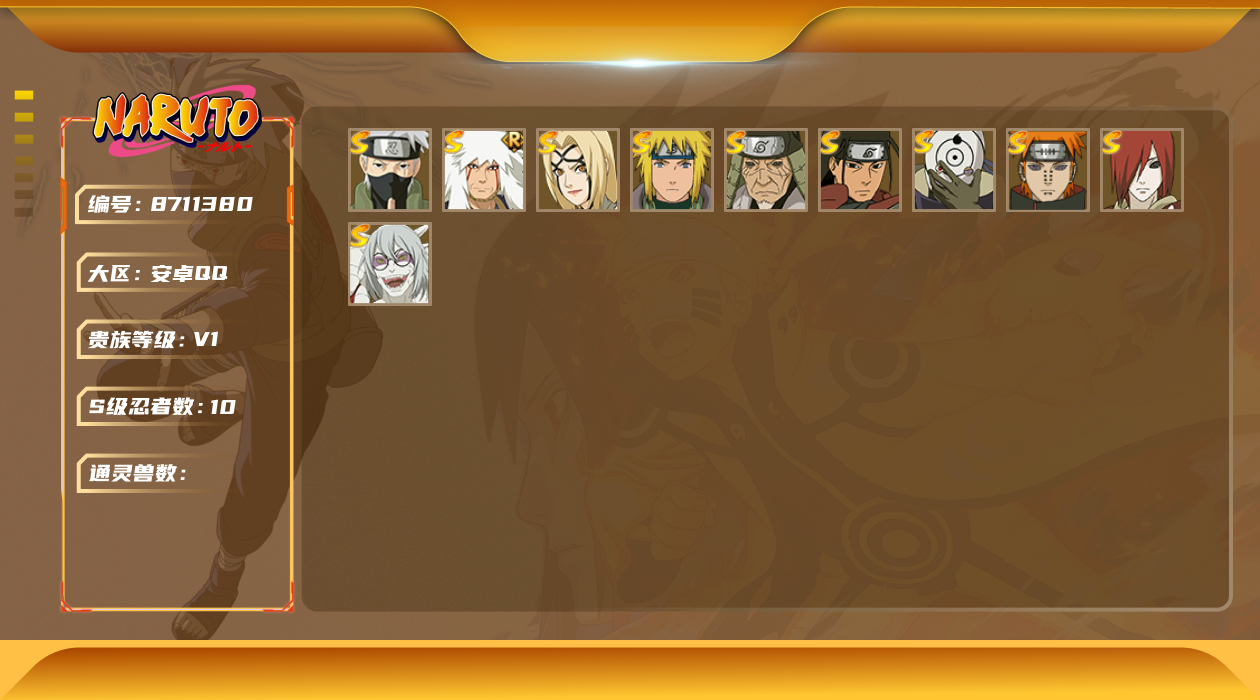 [8711380]v1 10s忍 580.4w战力 可二次 可修改实名 s级忍者:自来也 「舞之豪杰」旗木卡卡西「须佐能乎」药师兜「仙人模式」“宇智波斑” 「白面具」纲手「百豪」猿飞日斩「秽土转生」长门「秽土转生」千手柱间佩恩「天道」波风水门