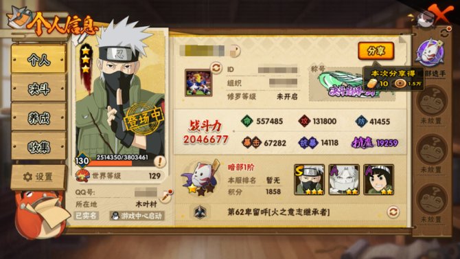 dhy327 "安卓q火影130级 v6 5s 9a 204万战力 60忍者 11通灵兽 352