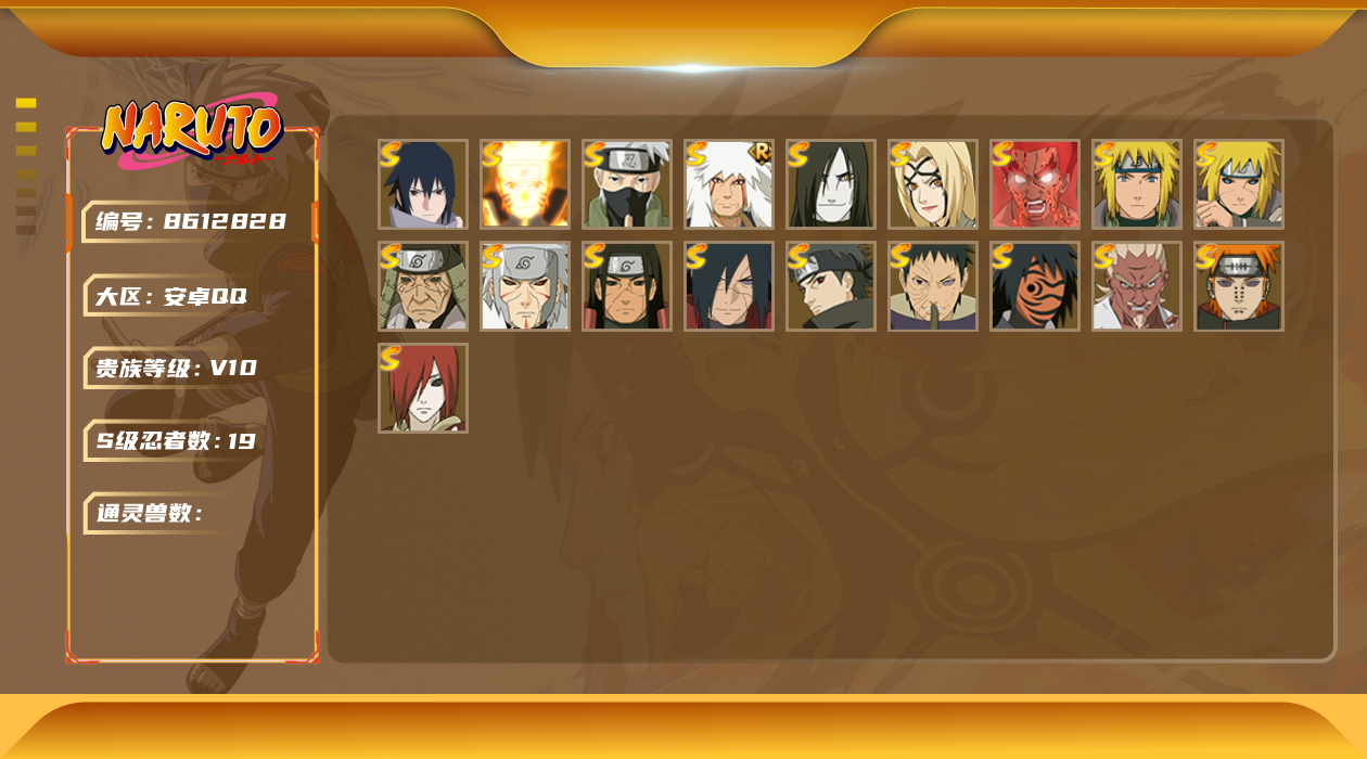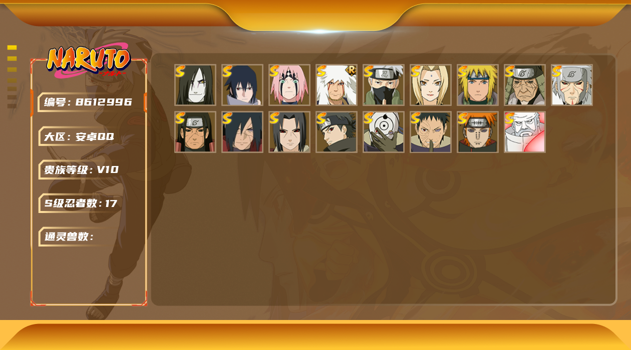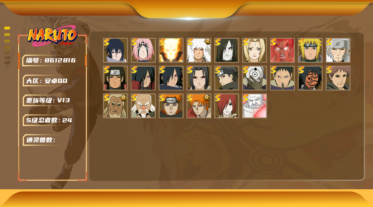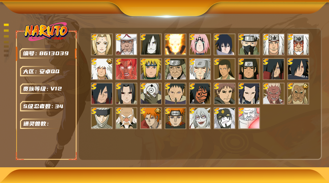 [8612996]v10 17s 可二次 可修改实名 s级忍者:宇智波止水「须佐能乎」宇智波斑「秽土转生·解」宇智波佐助「永恒万花筒」春野樱 「忍界大战」大筒木金式「博人传」宇智波带土 「忍界大战」千手柱间「秽土转生」自来也 「舞之豪杰」旗木卡卡西「须佐能乎」宇智波鼬「秽土转生」“宇智波斑” 「白面具」千手扉间「秽土转生」猿飞日斩「秽土转生」佩恩「天道」波风水门大蛇丸纲手