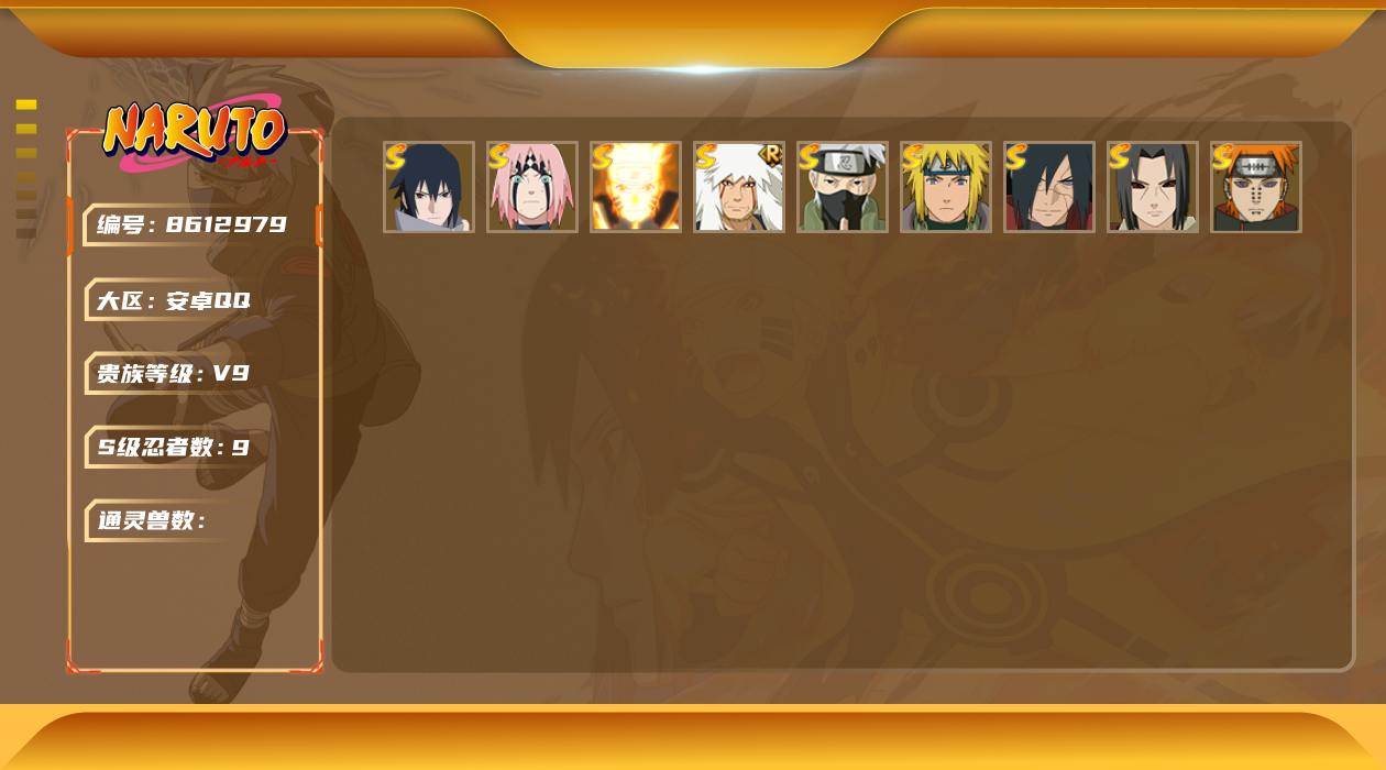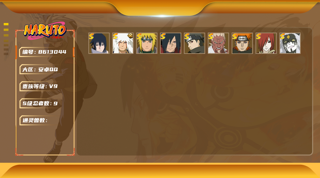 [8612979]v9 9s 可二次 可修改实名 s级忍者:宇智波斑「秽土转生·解」宇智波佐助「永恒万花筒」春野樱 「忍界大战」漩涡鸣人 「九喇嘛连结」自来也 「舞之豪杰」旗木卡卡西「须佐能乎」宇智波鼬「秽土转生」佩恩「天道」波风水门