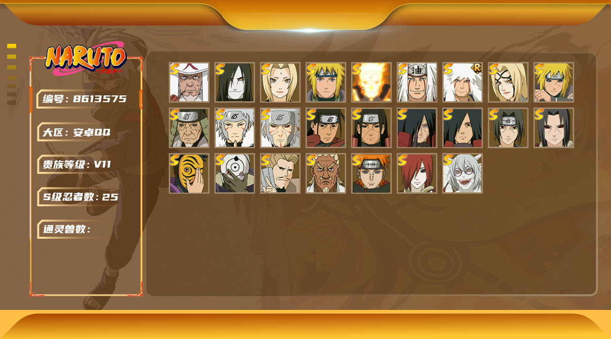 [8613575]v11 25s忍 1436.3w战力 可二次 可修改实名 s级忍者:漩涡鸣人 「九喇嘛连结」千手柱间「秽土转生」自来也 「舞之豪杰」宇智波鼬「秽土转生」药师兜「仙人模式」宇智波斑「秽土转生」“宇智波斑” 「白面具」千手扉间「秽土转生」纲手「百豪」波风水门「秽土转生」猿飞日斩「秽土转生」长门「秽土转生」鬼灯幻月「二代目水影」宇智波斑千手柱间艾「四代目雷影」千手扉间神秘面具男宇智波鼬 「须佐能乎」佩恩「天道」猿飞日斩波风水门大蛇丸自来也纲手