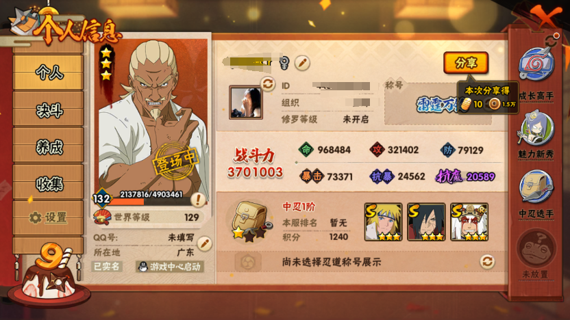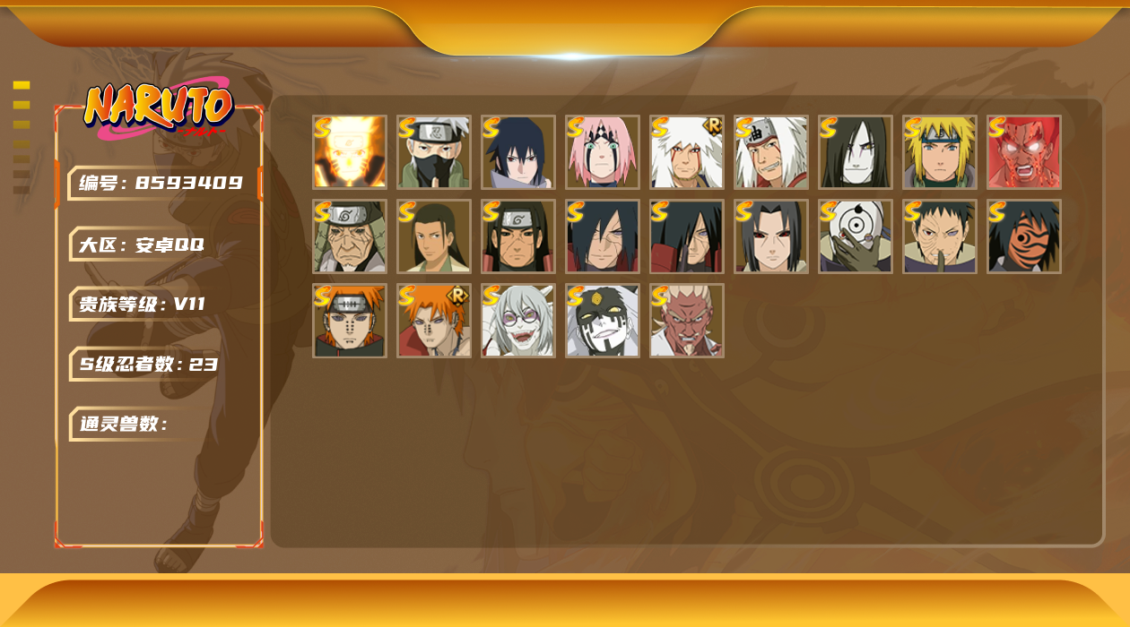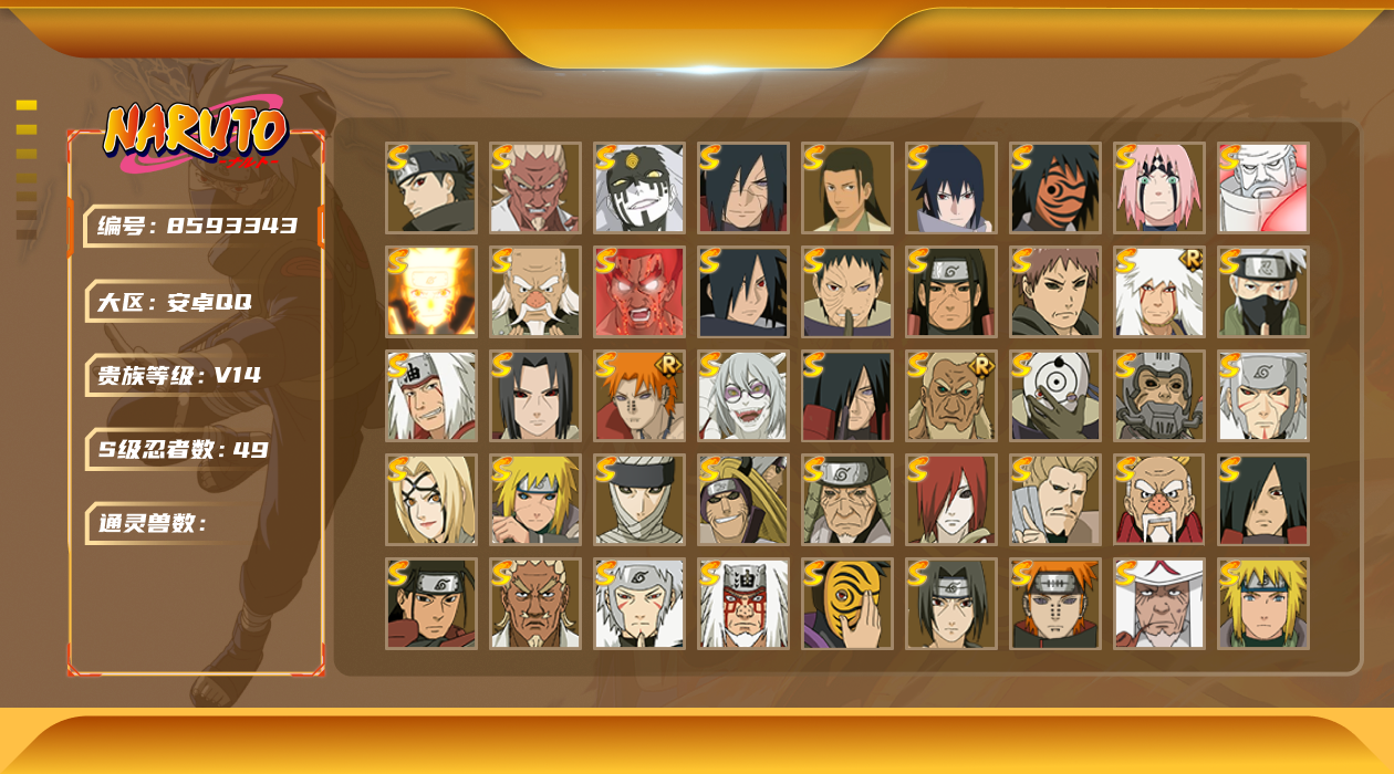 [5158229]实名: 可修改 贵族等级: v10 s忍数: 8 a忍数: 17 战力值万: 4232638 s级忍者: 佩恩「天道」大蛇丸波风水门迈特凯「死门」大野木 「忍界大战」自来也 「舞之豪杰」漩涡鸣人 「九喇嘛连结」宇智波斑「秽土转生·解」 通灵兽: 忍犬忍龟蛤蟆吉蓝蛇猿魔蛞蝓蛤蟆仙人镰鼬山椒鱼蜃鲛鲨蛤蟆健乌鸦砂之守鹤