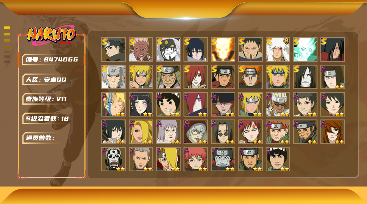 林逸826341 【商品标题】:2s级忍者数-2a级忍者数 【s级忍者】:自来也「舞之豪杰」3星,佩恩「天道」3星 【a级忍者】:宇智波鼬2星,宇智波泉奈2星 【通灵兽】:忍犬,蓝蛇,蛤蟆吉,忍龟,砂之守鹤,镰鼬