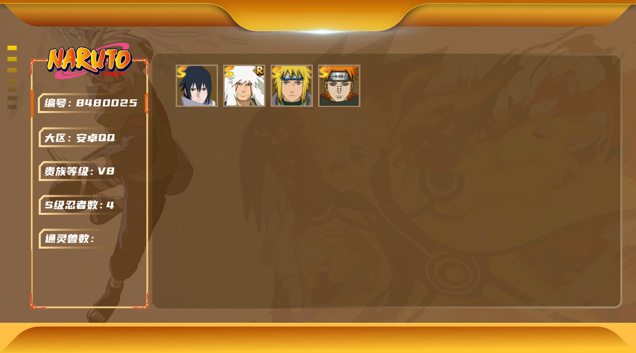 [8480052]v4 4s忍 415.5w战力 可二次 可修改实名 s级忍者:自来也 「舞之豪杰」旗木卡卡西「须佐能乎」自来也 「传说中的三忍」佩恩「天道」