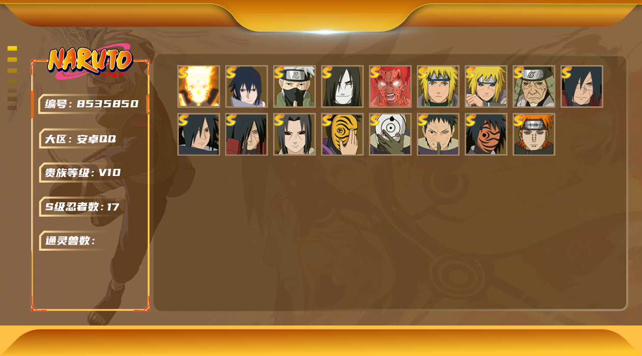 [8535850]v10 17s 可二次 s级忍者:宇智波斑「秽土转生·解」宇智波佐助「永恒万花筒」神秘面具男 「红夜之刃」漩涡鸣人 「九喇嘛连结」迈特凯「死门」宇智波斑 「木叶创立」宇智波带土 「忍界大战」旗木卡卡西「须佐能乎」宇智波鼬「秽土转生」宇智波斑「秽土转生」“宇智波斑” 「白面具」波风水门「秽土转生」猿飞日斩「秽土转生」神秘面具男佩恩「天道」波风水门大蛇丸